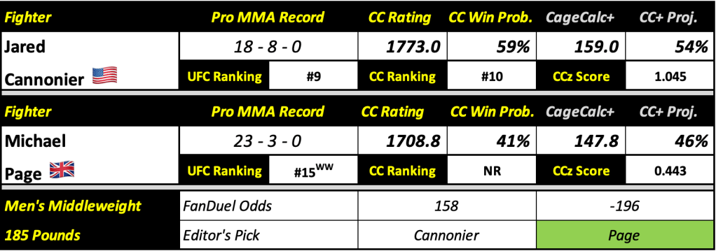 A fighter’s CC win probabilities are based off of a fighter’s Cage Calculus (CC) Rating and their place in the CC Rankings. A fighter’s CageCalc+ Score is determined by a variety of factors and is specific to each matchup. The CageCalc+ projection is an estimated win probability based on this statistic. Each fighter’s new CC Ratings after their bouts will be determined by the first CC win probability only.