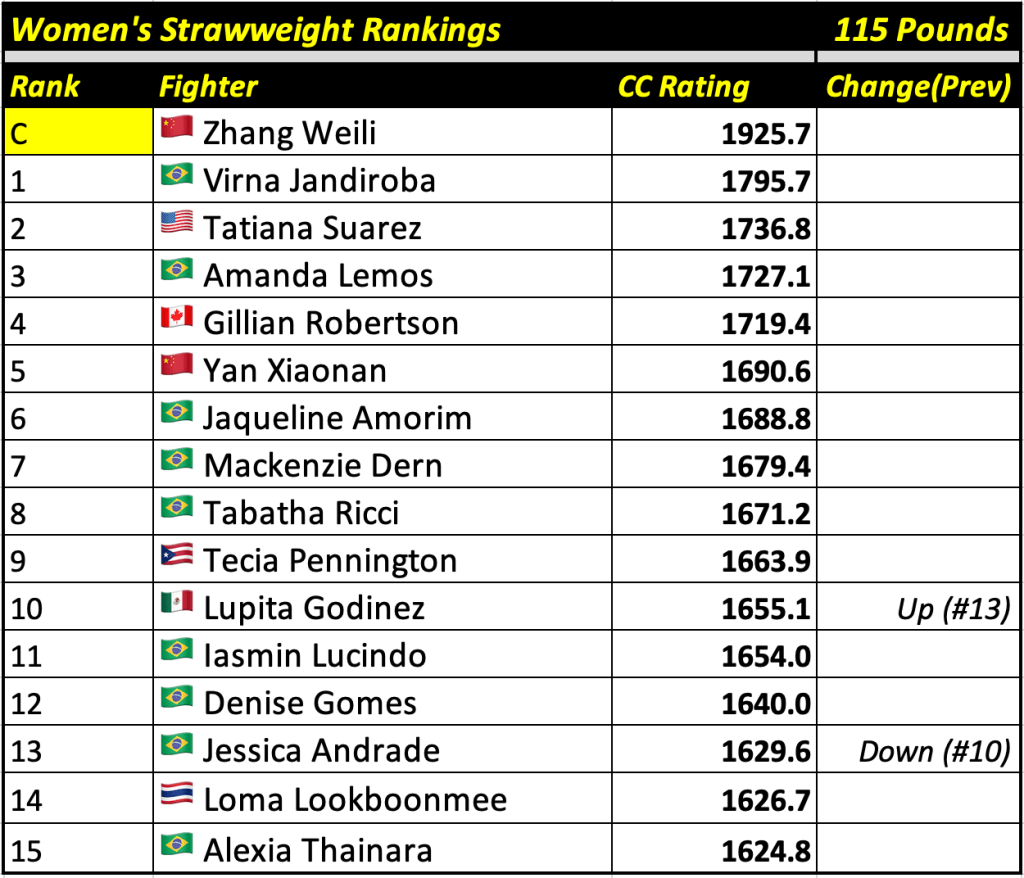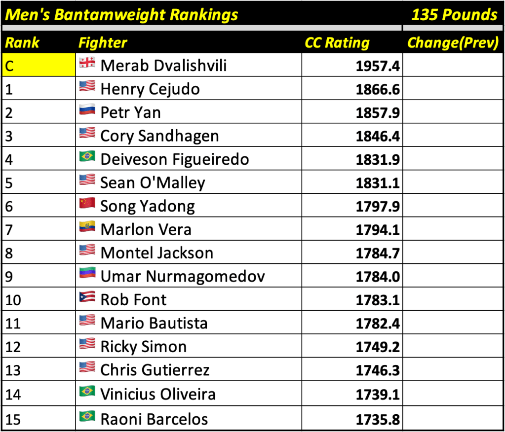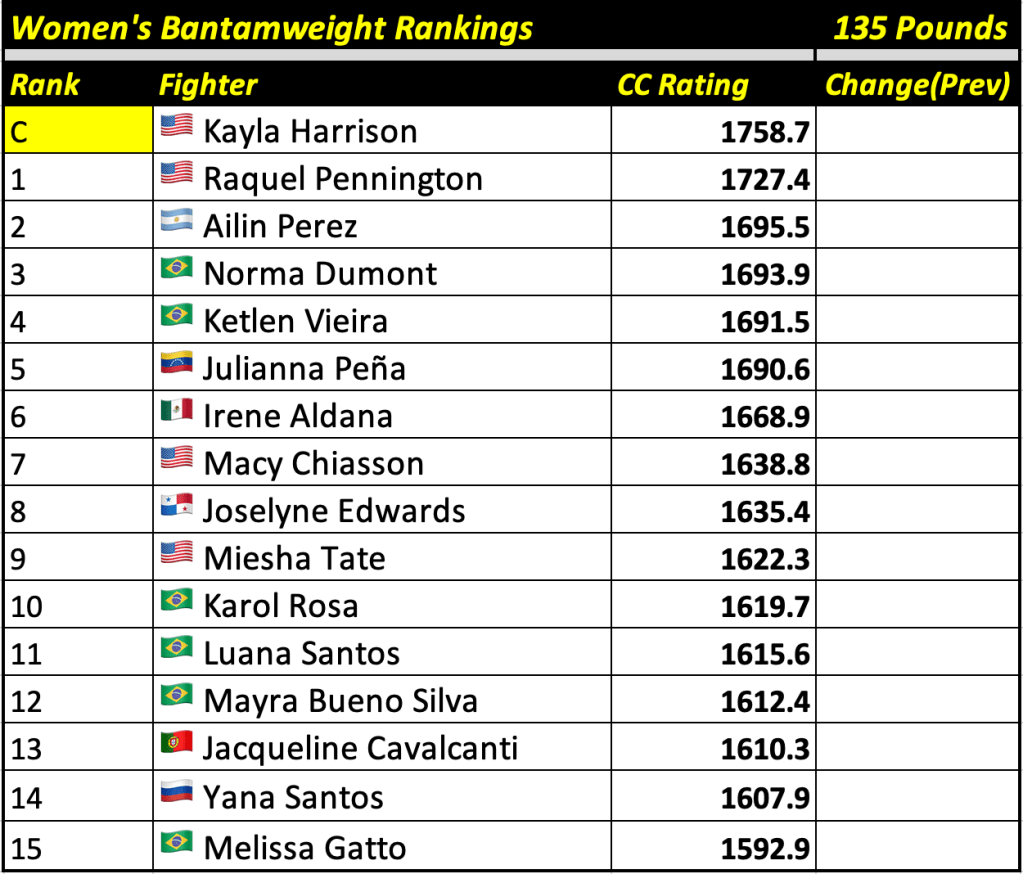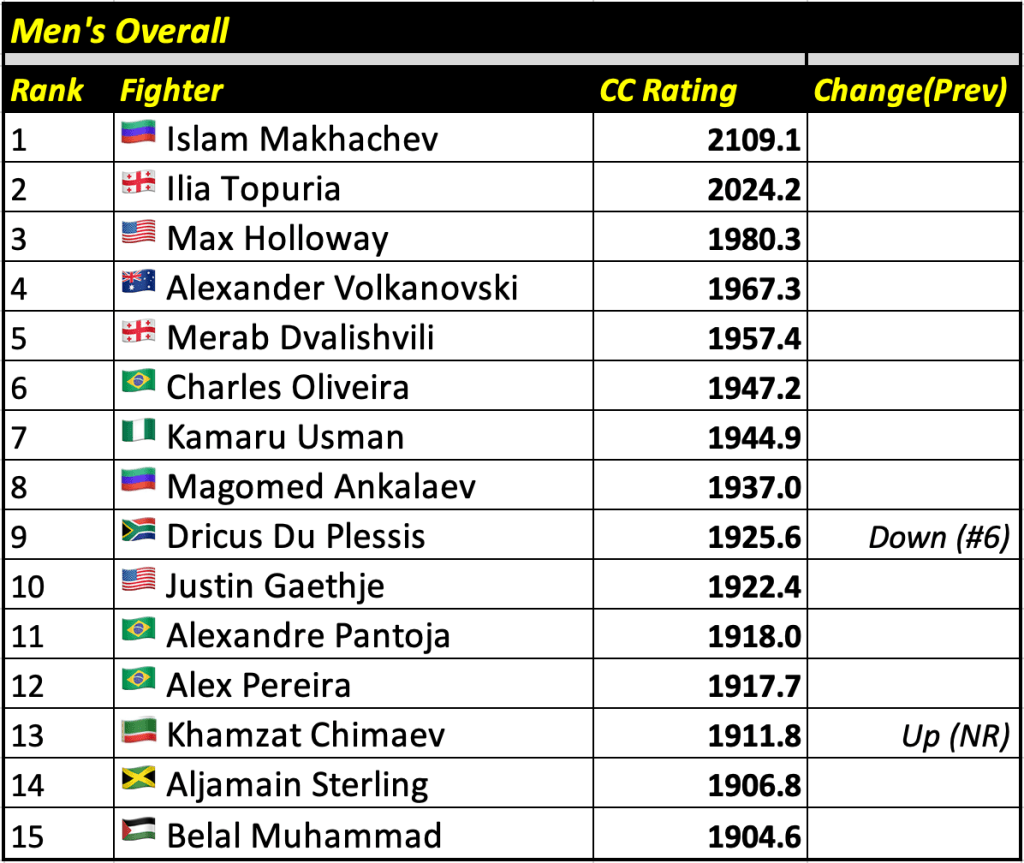 These rankings will also rank the top 15 male and female fighters overall. Note, we do not call them “pound-for-pound” rankings as most do, as the CC Rating is a metric of dominance and performance as opposed to talent relative to size. So, they will simply be called “Overall Male” and “Overall Female” rankings.