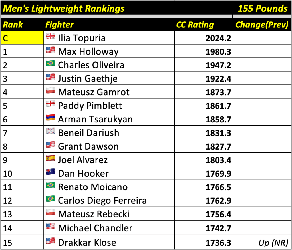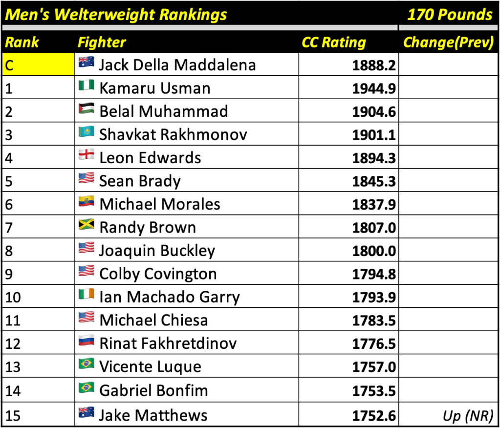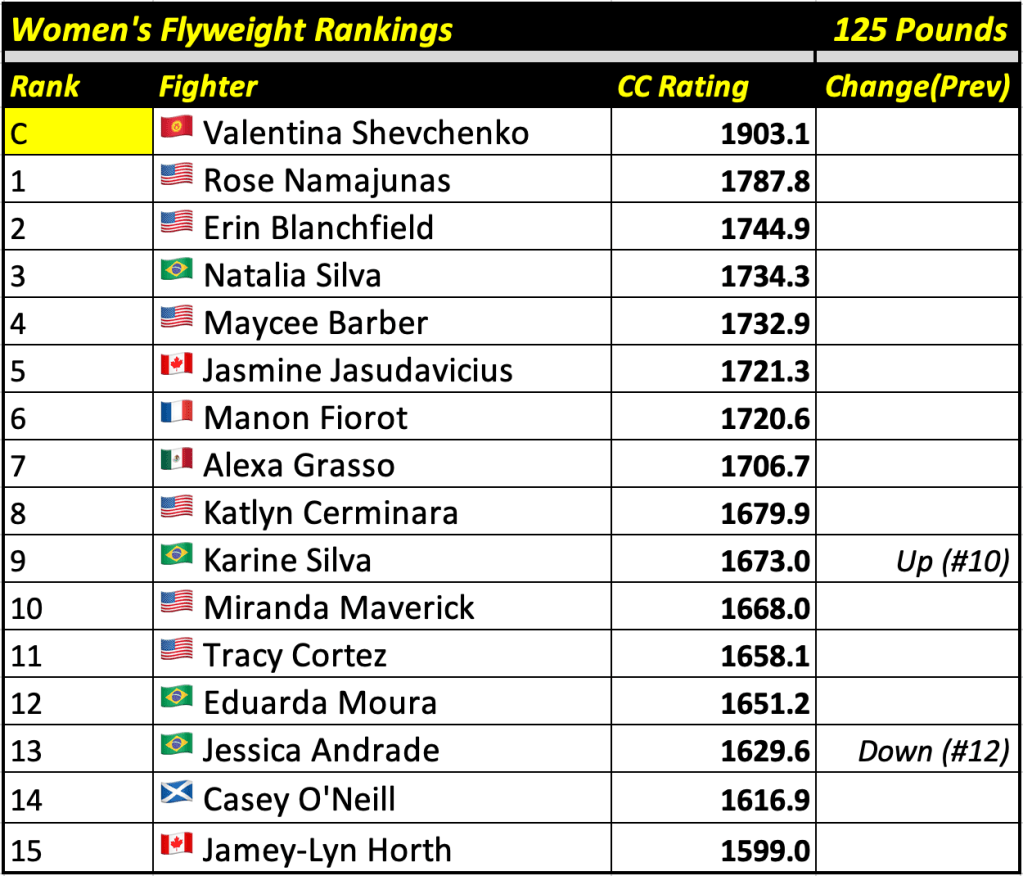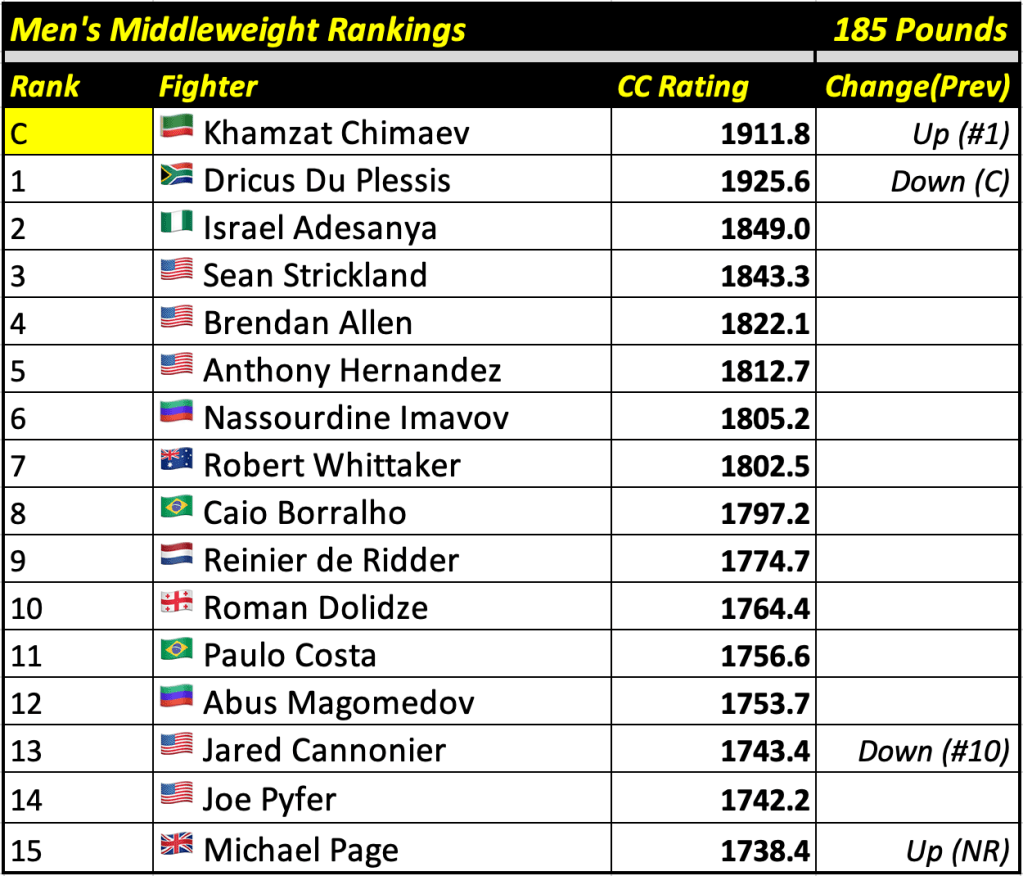 These rankings will also rank the top 15 male and female fighters overall. Note, we do not call them “pound-for-pound” rankings as most do, as the CC Rating is a metric of dominance and performance as opposed to talent relative to size. So, they will simply be called “Overall Male” and “Overall Female” rankings.