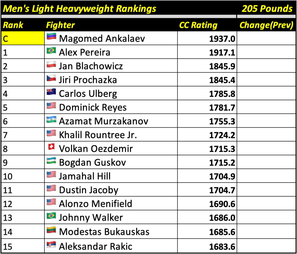 After every UFC fight card, Cage Calculus will publish up-to-date rankings based on our forecast algorithm. The rankings will display the champion and the top 15 contenders in each weight division, alongside their CC Rating (the champion will always be displayed at the top regardless of whether or not they are the highest rated fighter in their division).