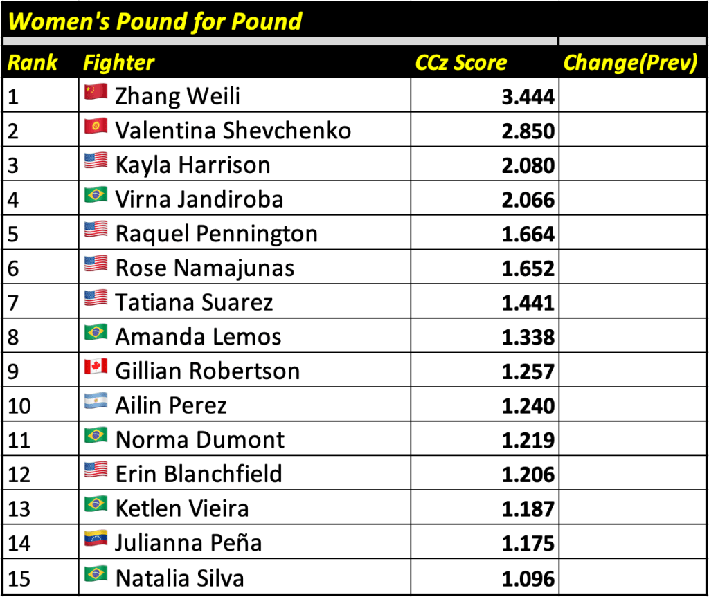 The Cage Calculus Pound for Pound Rankings is based on a fighter’s CCz Score. The CCz Score is a score that shows how much better a given fighter is than the average fighter in their respective weight class.