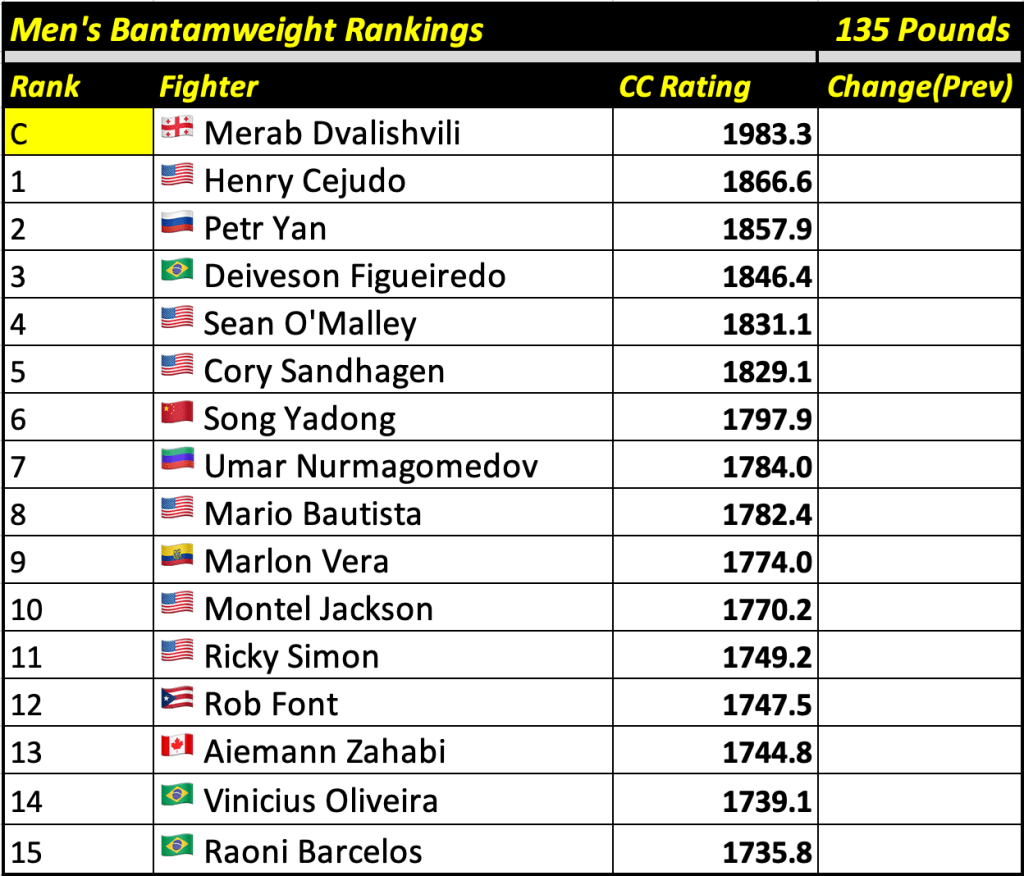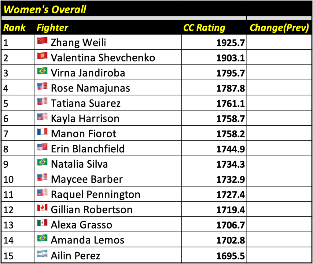 These rankings will also rank the top 15 male and female fighters overall. Note, we do not call them “pound-for-pound” rankings as most do, as the CC Rating is a metric of dominance and performance as opposed to talent relative to size. So, they will simply be called “Overall Male” and “Overall Female” rankings.