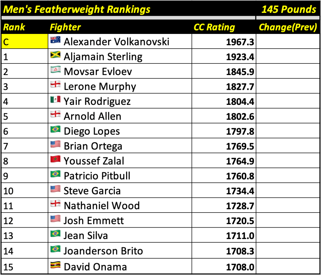 After every UFC fight card, Cage Calculus will publish up-to-date rankings based on our forecast algorithm. The rankings will display the champion and the top 15 contenders in each weight division, alongside their CC Rating (the champion will always be displayed at the top regardless of whether or not they are the highest rated fighter in their division).