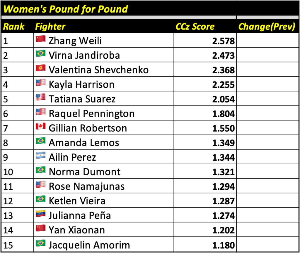 The Cage Calculus Pound for Pound Rankings is based on a fighter’s CCz Score. The CCz Score is a score that shows how much better a given fighter is than the average fighter in their respective weight class.