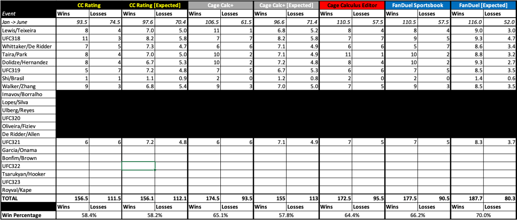 After every event, check back in to see how Cage Calculus did at forecasting the prior week’s slate of UFC fights. These standing will compare our traditional algorithm, our new CageCalc+ model, our editor’s picks, and FanDuel Sportsbook’s favorites. You can also see how many wins each algorithm expects, given the probabilities it generates (for example, if the algorithm gives ten fighters a 60 percent chance of winning, it would only expect six of them to win with those odds). How close the algorithm is to its expected numbers gives a better picture of its accuracy.