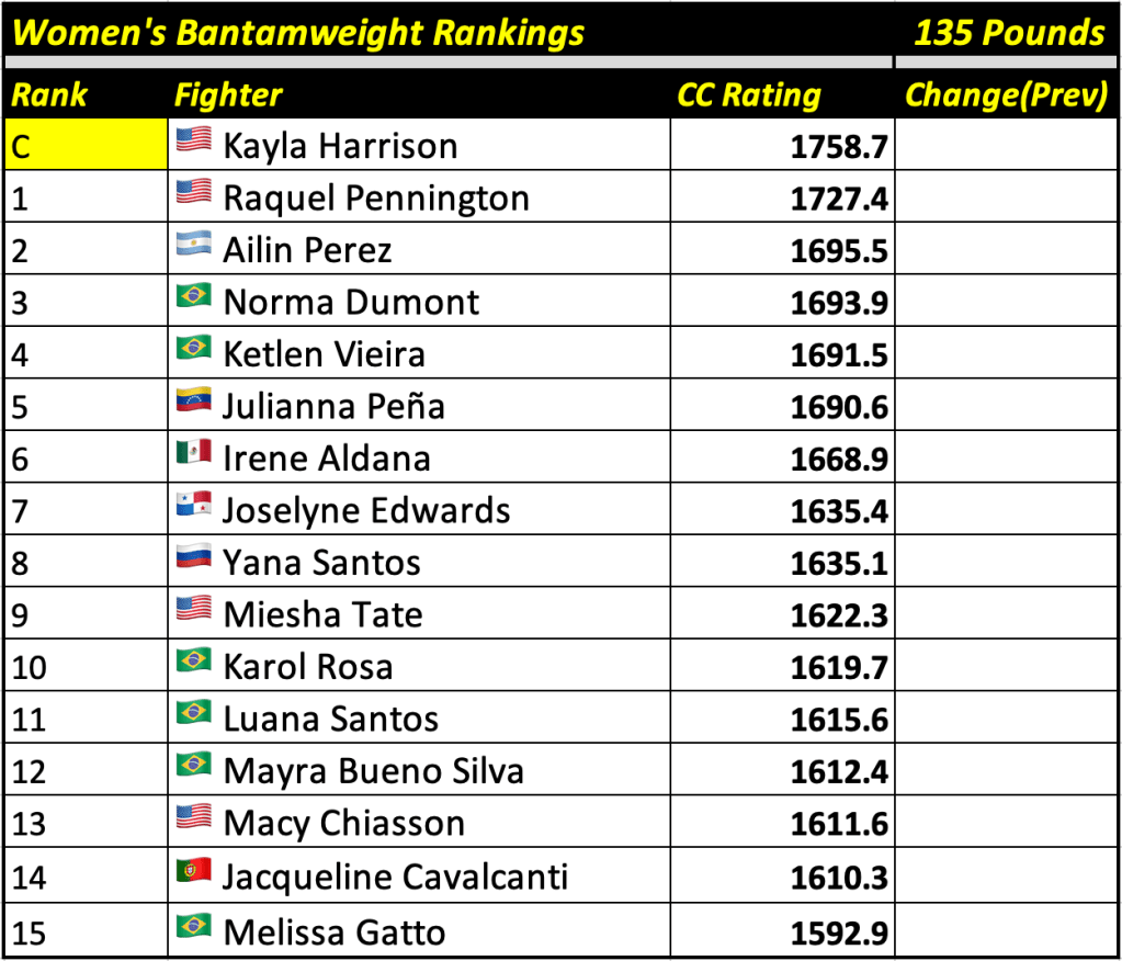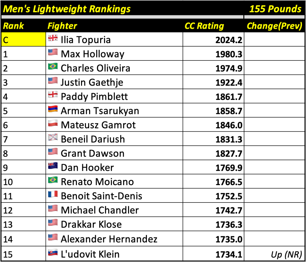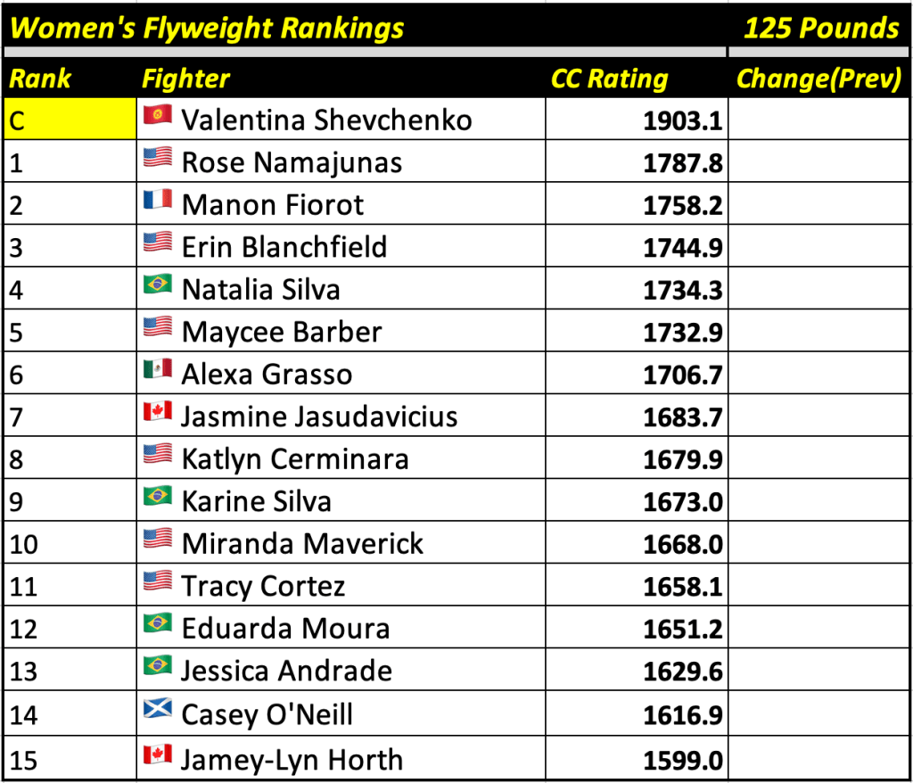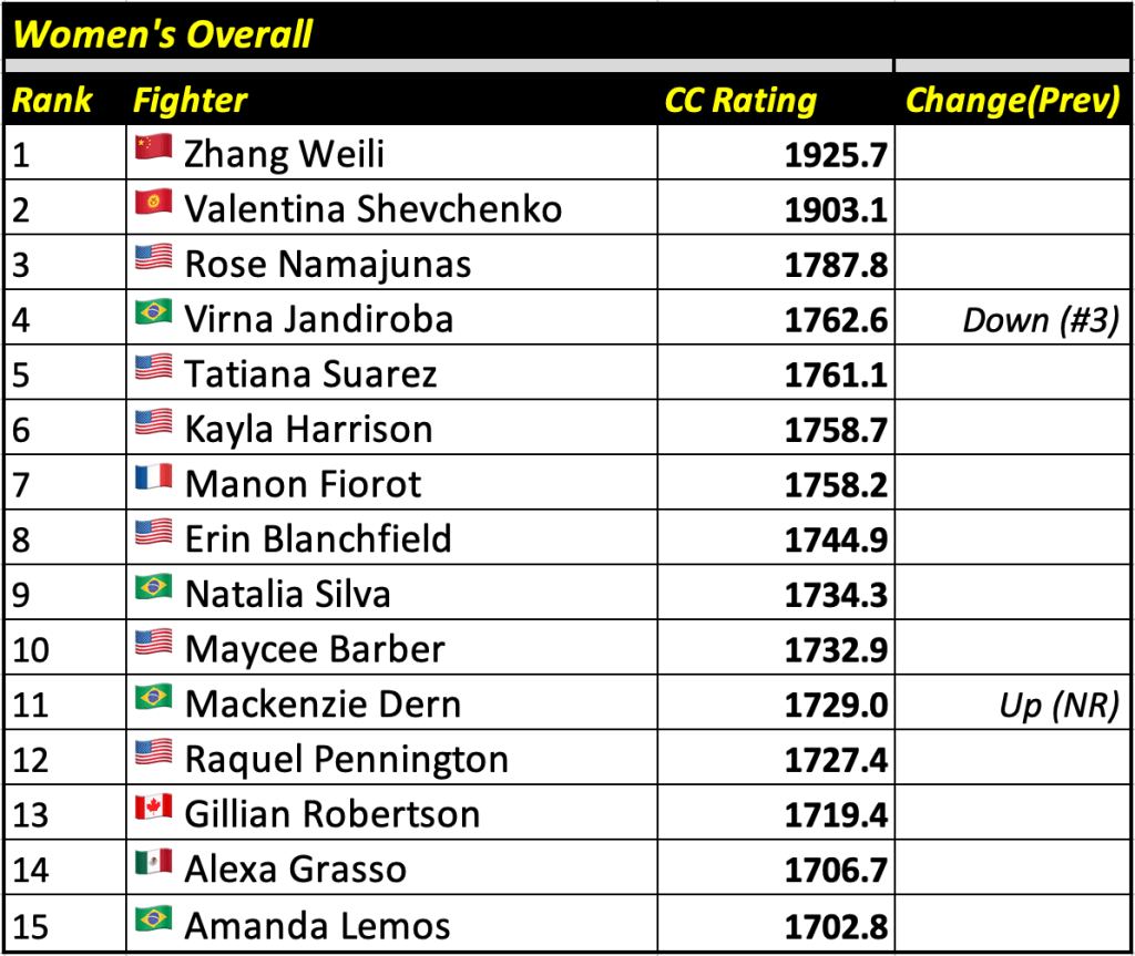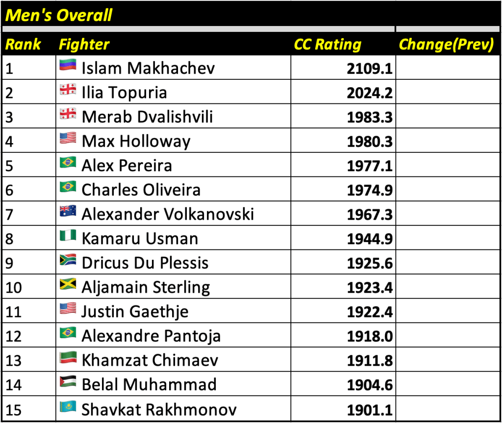These rankings will also rank the top 15 male and female fighters overall. Note, we do not call them “pound-for-pound” rankings as most do, as the CC Rating is a metric of dominance and performance as opposed to talent relative to size. So, they will simply be called “Overall Male” and “Overall Female” rankings.