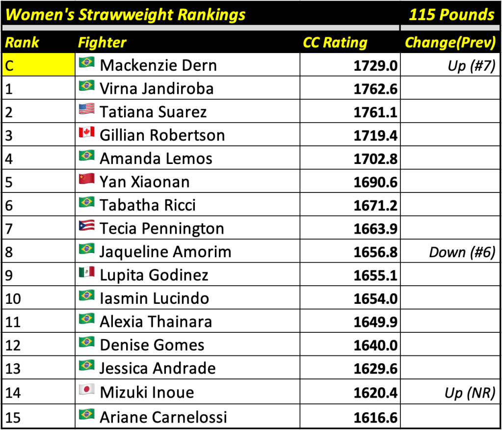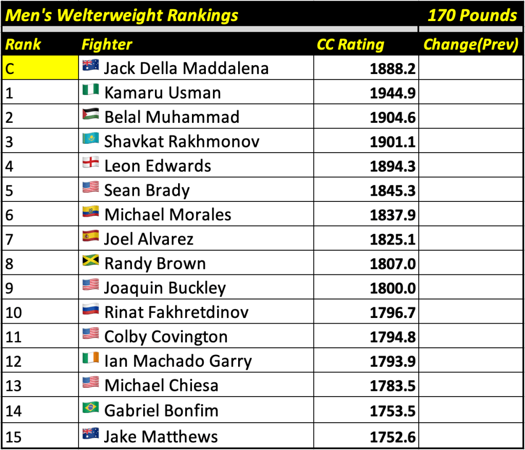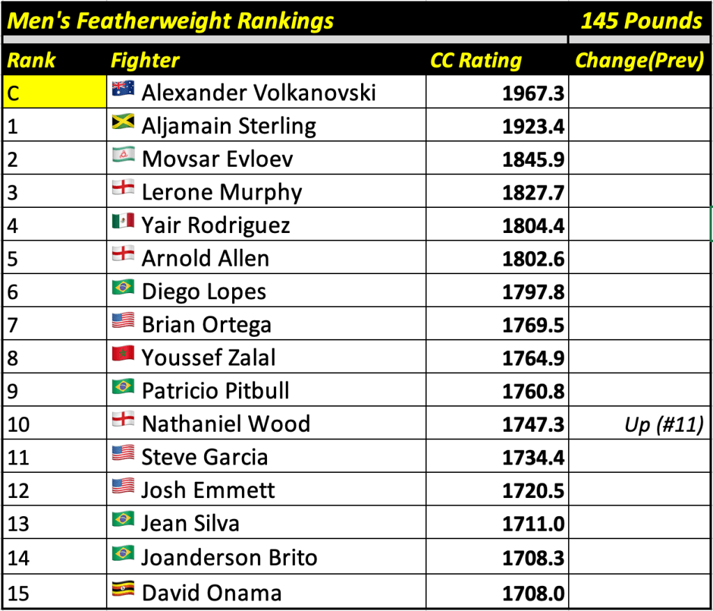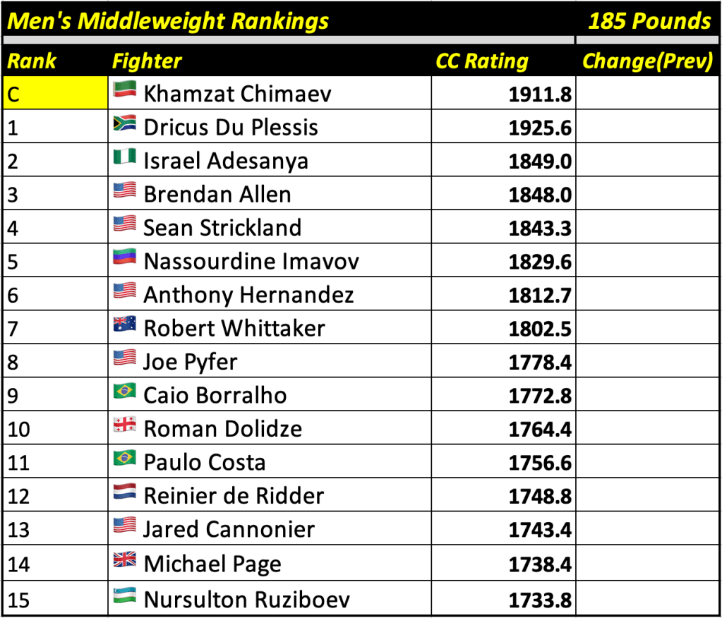 These rankings will also rank the top 15 male and female fighters overall. Note, we do not call them “pound-for-pound” rankings as most do, as the CC Rating is a metric of dominance and performance as opposed to talent relative to size. So, they will simply be called “Overall Male” and “Overall Female” rankings.