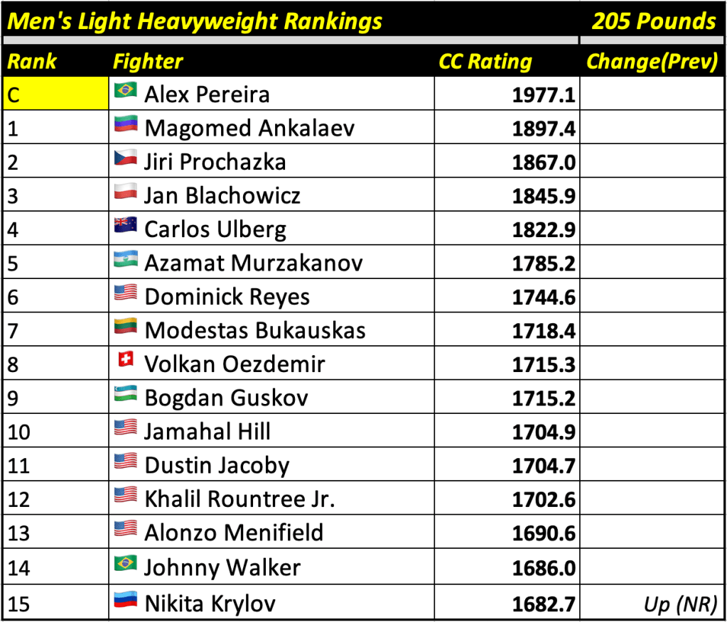 After every UFC fight card, Cage Calculus will publish up-to-date rankings based on our forecast algorithm. The rankings will display the champion and the top 15 contenders in each weight division, alongside their CC Rating (the champion will always be displayed at the top regardless of whether or not they are the highest rated fighter in their division).