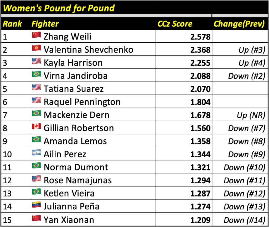 The Cage Calculus Pound for Pound Rankings is based on a fighter’s CCz Score. The CCz Score is a score that shows how much better a given fighter is than the average fighter in their respective weight class.