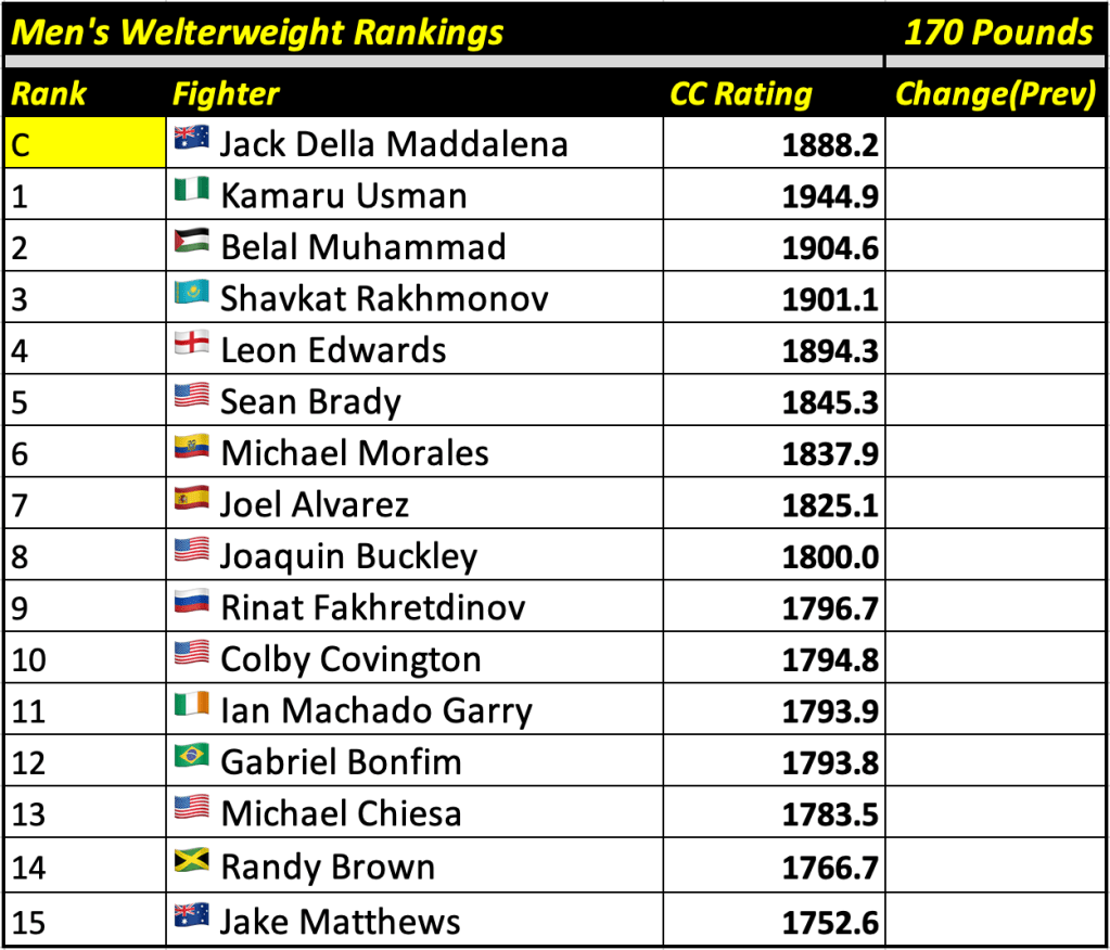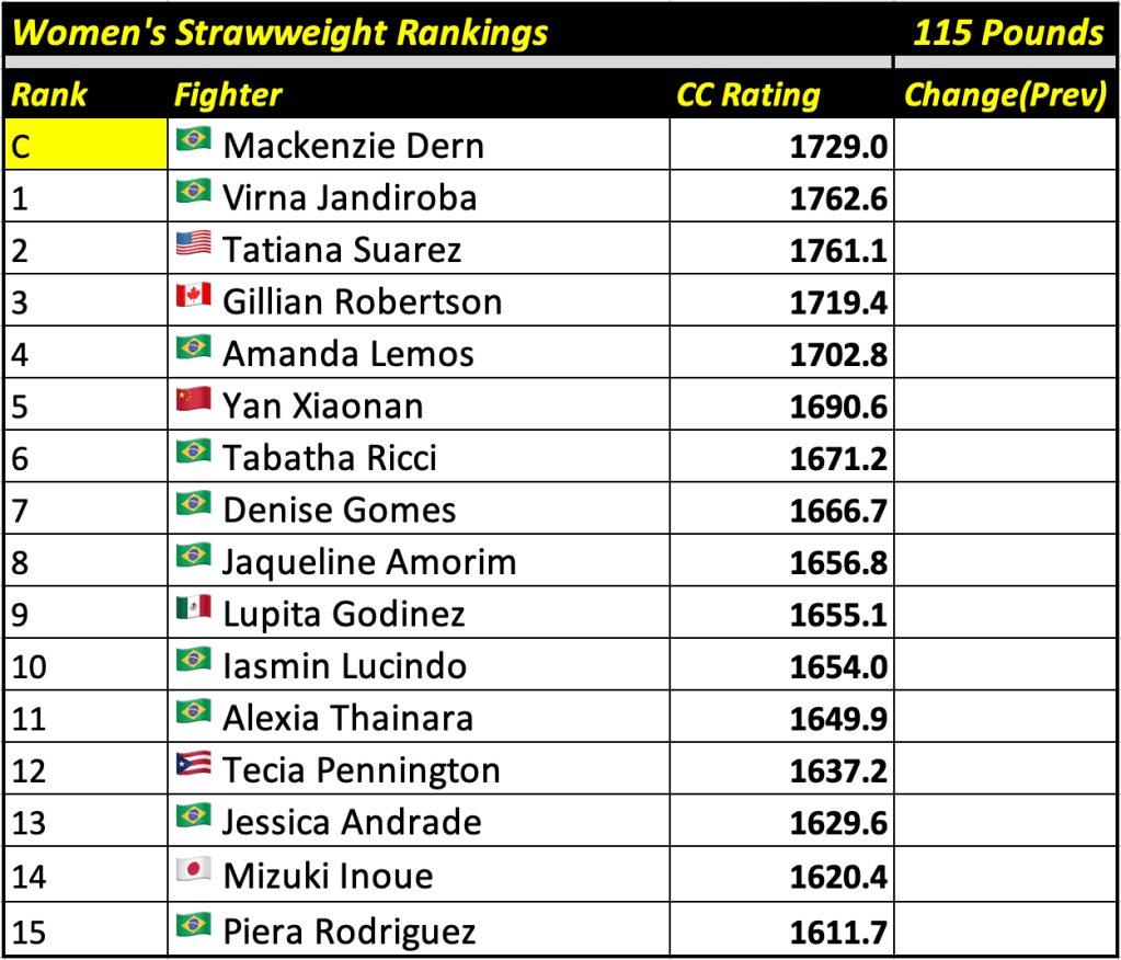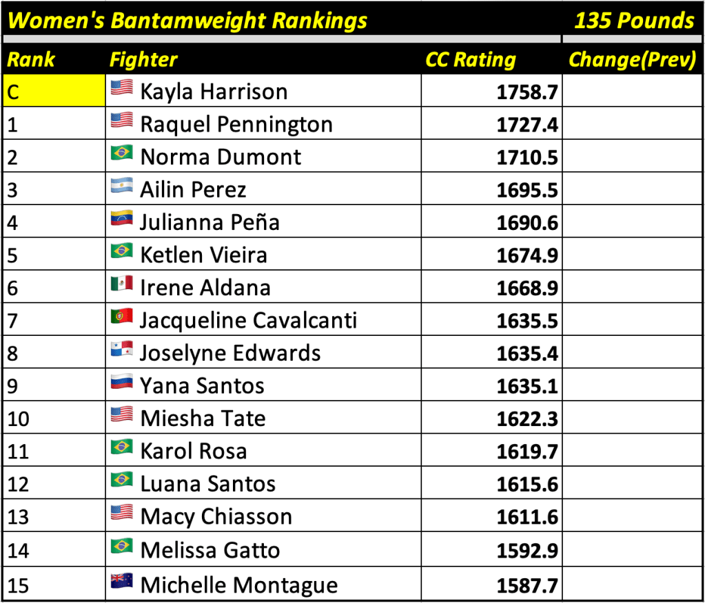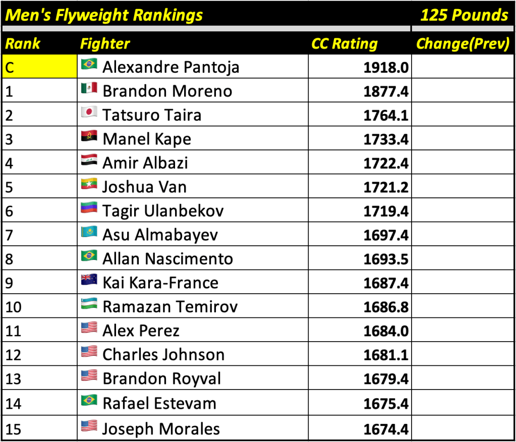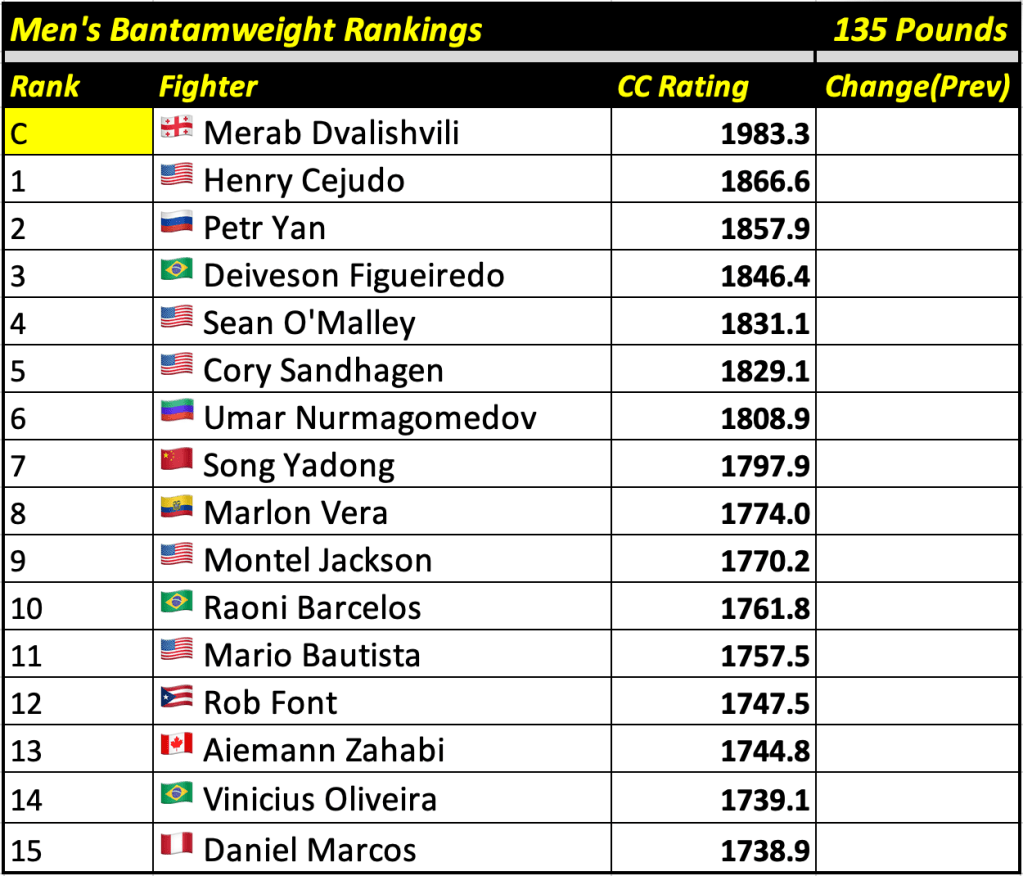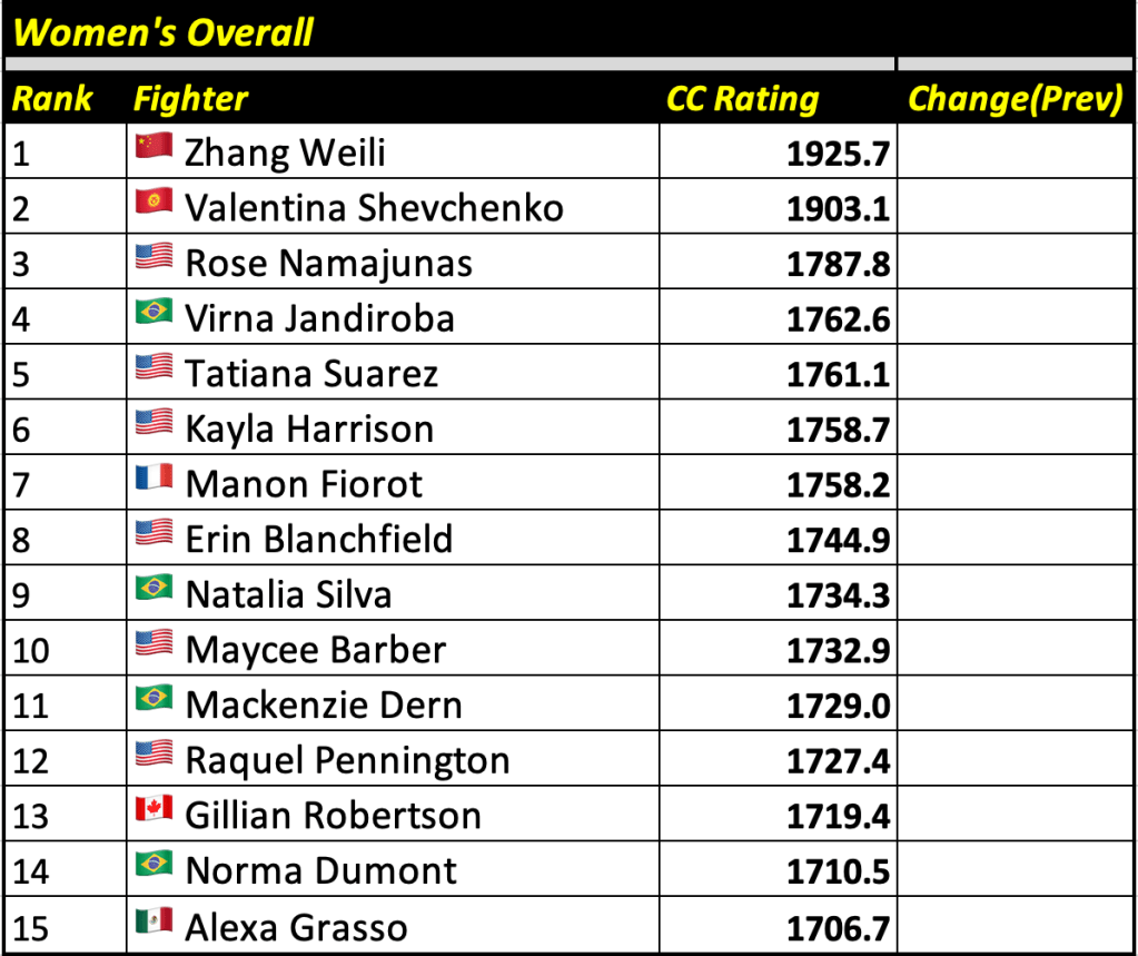 These rankings will also rank the top 15 male and female fighters overall. Note, we do not call them “pound-for-pound” rankings as most do, as the CC Rating is a metric of dominance and performance as opposed to talent relative to size. So, they will simply be called “Overall Male” and “Overall Female” rankings.