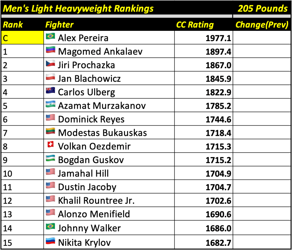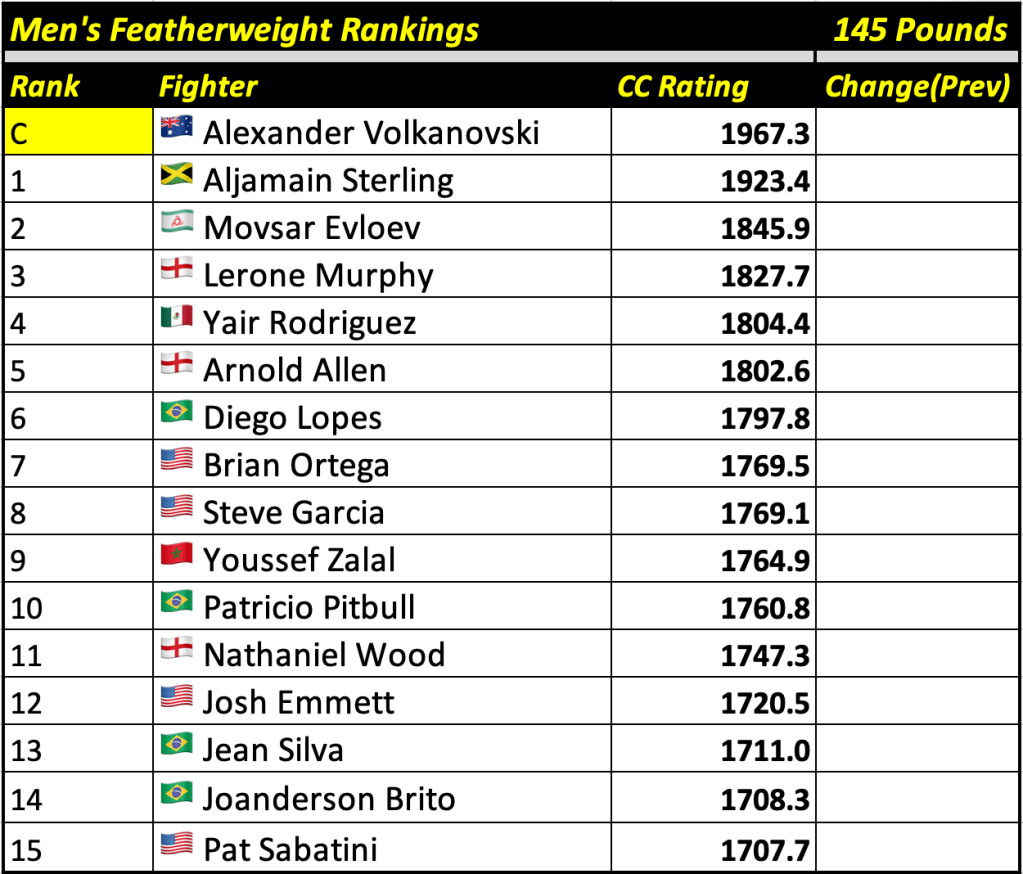 After every UFC fight card, Cage Calculus will publish up-to-date rankings based on our forecast algorithm. The rankings will display the champion and the top 15 contenders in each weight division, alongside their CC Rating (the champion will always be displayed at the top regardless of whether or not they are the highest rated fighter in their division).