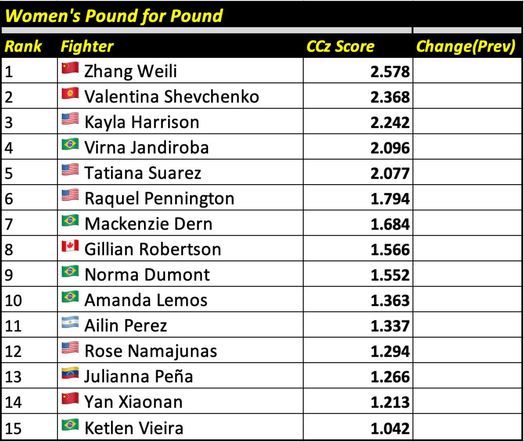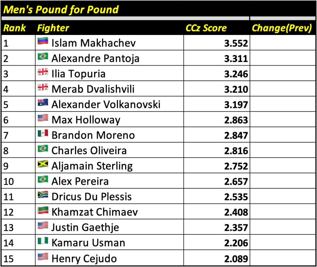 The Cage Calculus Pound for Pound Rankings is based on a fighter’s CCz Score. The CCz Score is a score that shows how much better a given fighter is than the average fighter in their respective weight class.