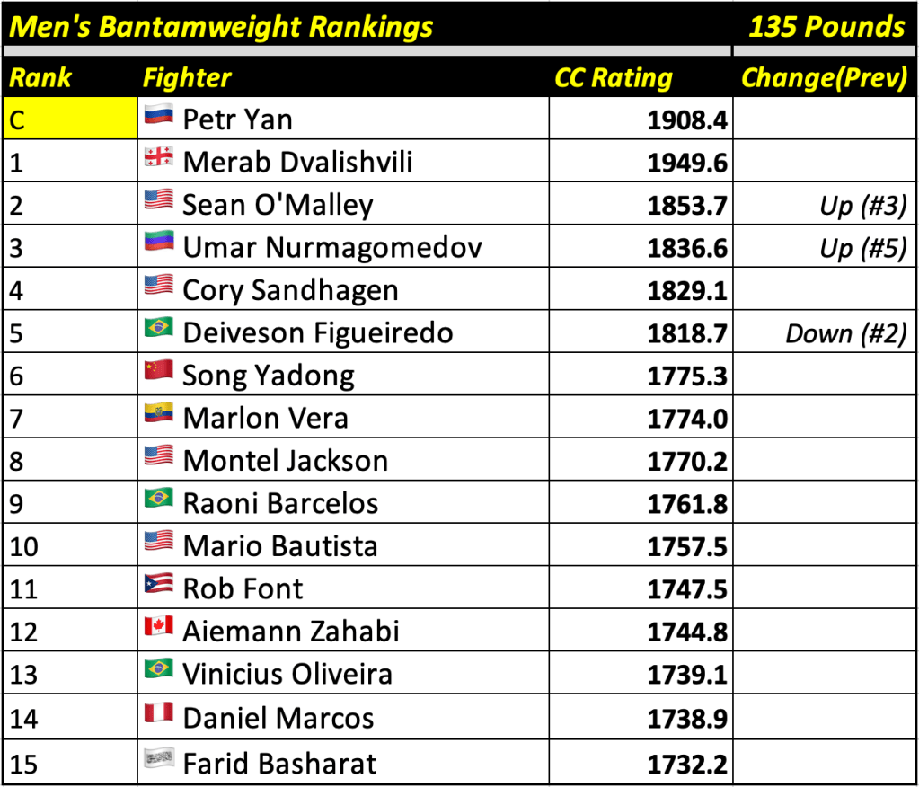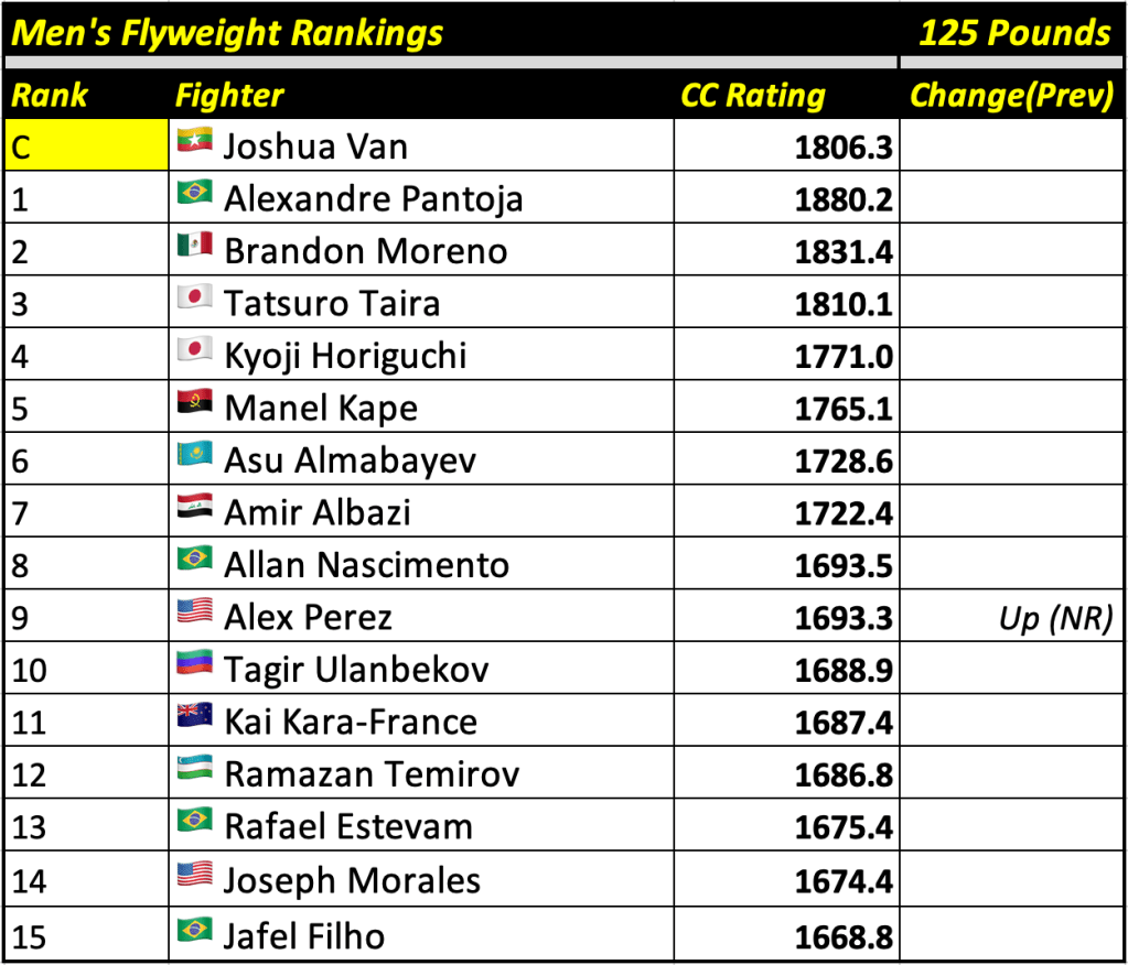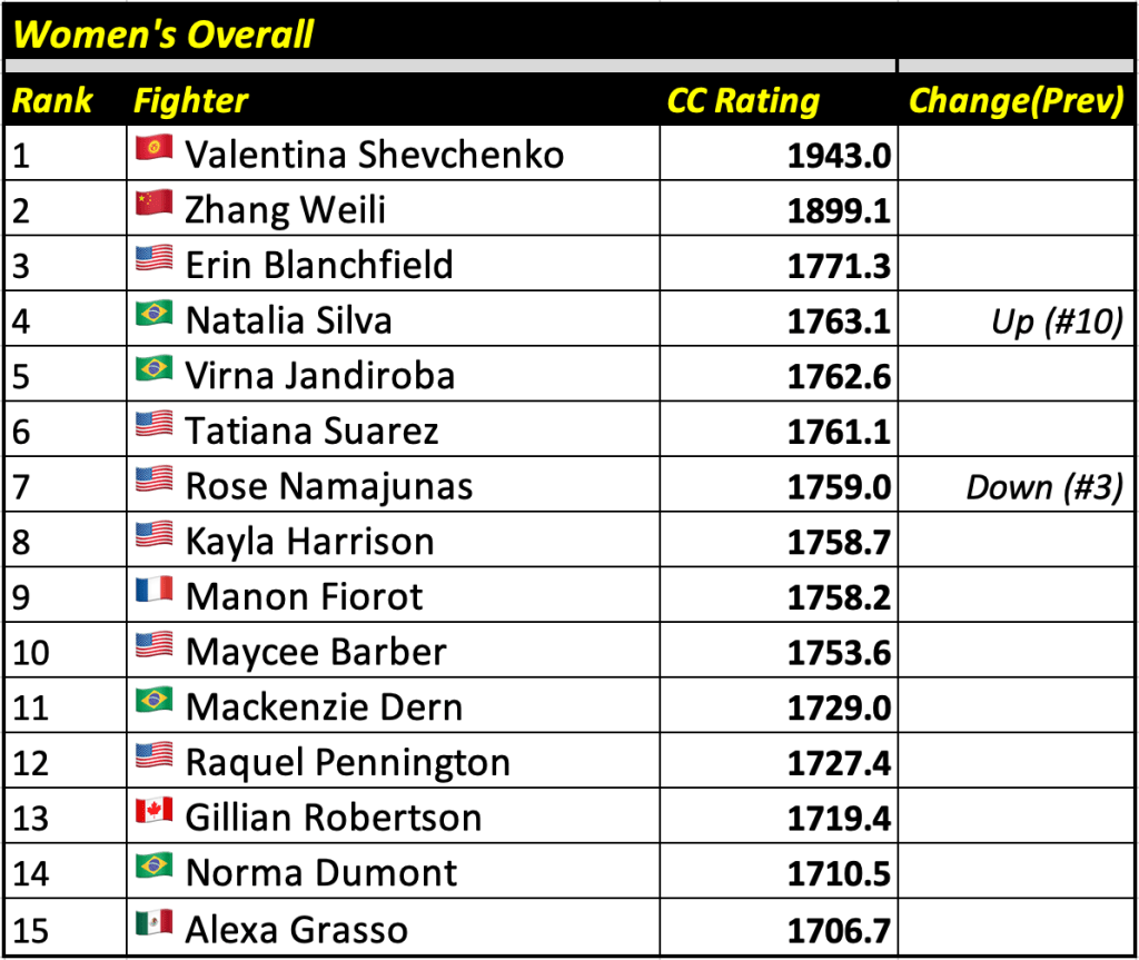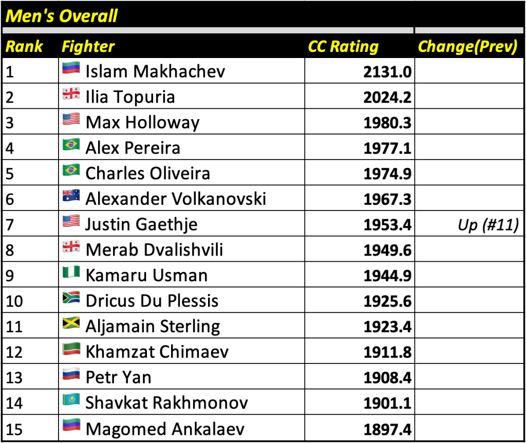 These rankings will also rank the top 15 male and female fighters overall. Note, we do not call them “pound-for-pound” rankings as most do, as the CC Rating is a metric of dominance and performance as opposed to talent relative to size. So, they will simply be called “Overall Male” and “Overall Female” rankings.