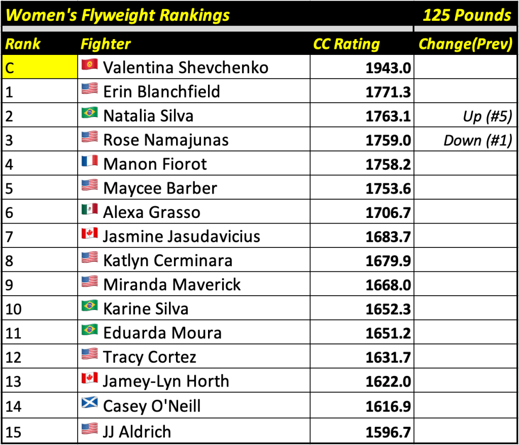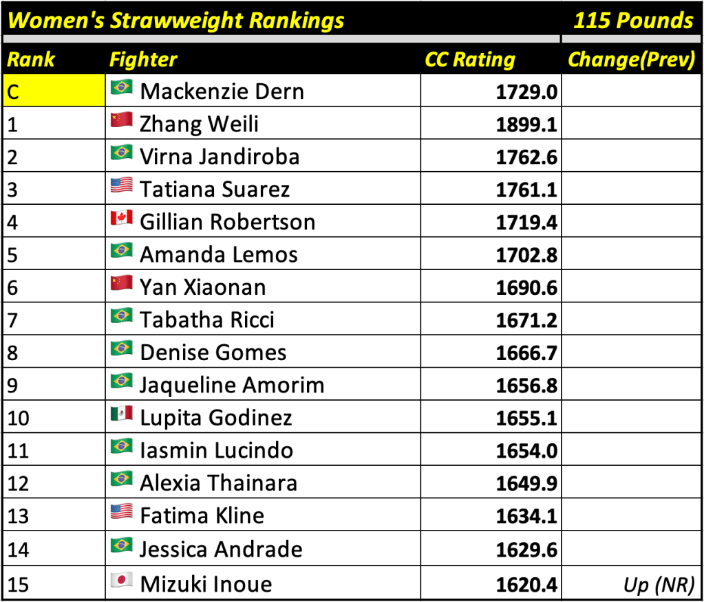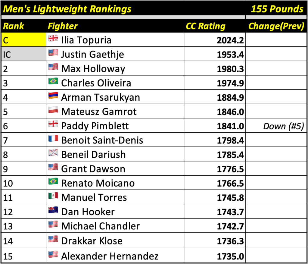 These rankings will also rank the top 15 male and female fighters overall. Note, we do not call them “pound-for-pound” rankings as most do, as the CC Rating is a metric of dominance and performance as opposed to talent relative to size. So, they will simply be called “Overall Male” and “Overall Female” rankings.
