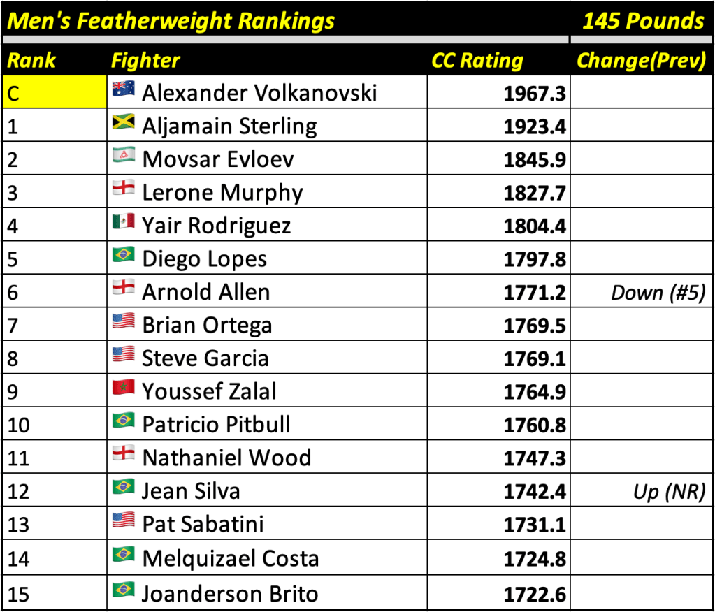 After every UFC fight card, Cage Calculus will publish up-to-date rankings based on our forecast algorithm. The rankings will display the champion and the top 15 contenders in each weight division, alongside their CC Rating (the champion will always be displayed at the top regardless of whether or not they are the highest rated fighter in their division).