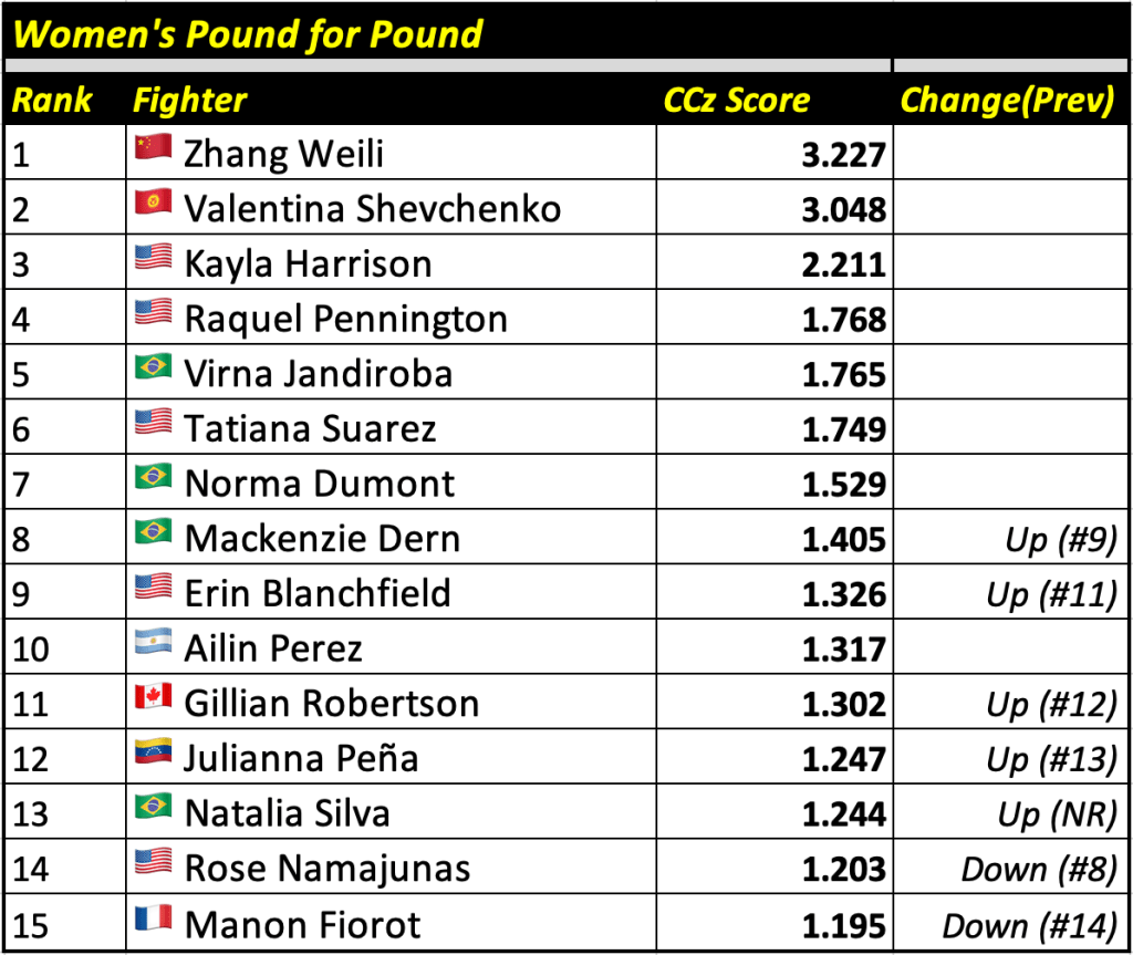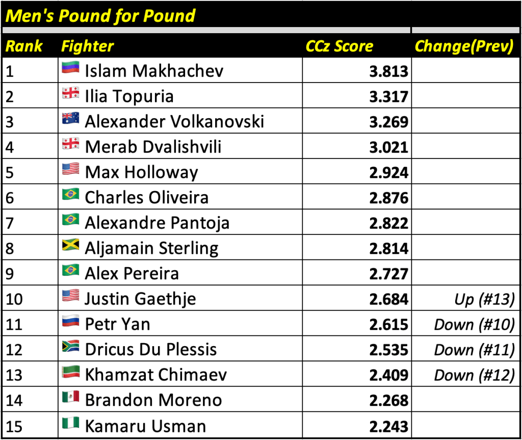 The Cage Calculus Pound for Pound Rankings is based on a fighter’s CCz Score. The CCz Score is a score that shows how much better a given fighter is than the average fighter in their respective weight class.
