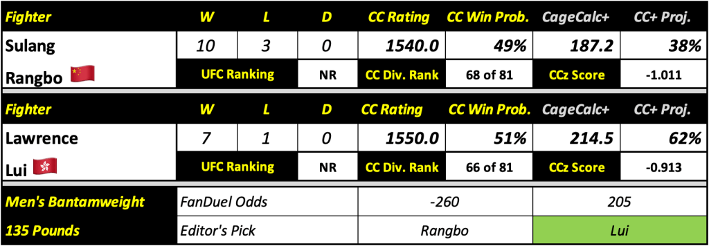 Editor’s Note: Sulangrangbo has not landed one takedown in his last two fights. Lui, on the other hand, has landed an astonishing 4.13 takedowns per 15 minutes over his last two fights. Add to that the fact that these two have very similar striking numbers and Lui will come in with a sizable six-inch reach advantage, the underdog from Hong Kong is very live to start the night.