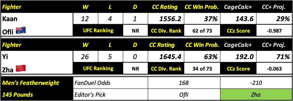 Editor’s Note: Both of these men are accomplished submission artists. However, Zha is far more willing to be the aggressor when it comes to wrestling. He should dictate how this fight goes down. Given Ofli’s failure to defend a single takedown thus far in the UFC, he’ll likely be relegated to trying to get a submission off his back. He’s capable of it, but it’s such a narrow path to victory. Zha should take this one handily.