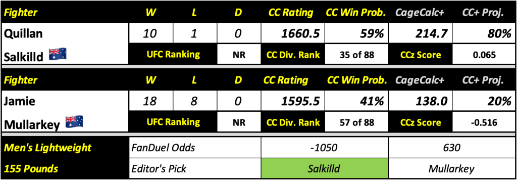 Editor’s Note: Mullarkey has a bad habit of getting KO’d and is taking this fight on short notice against a guy who’s scored first round KOs in two of his first three UFC bouts. Salkilld will use his wrestling as a threat to open up the striking and find another early KO in this one. Don’t overthink it.