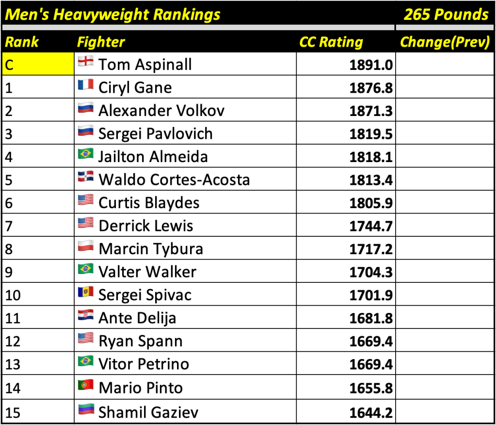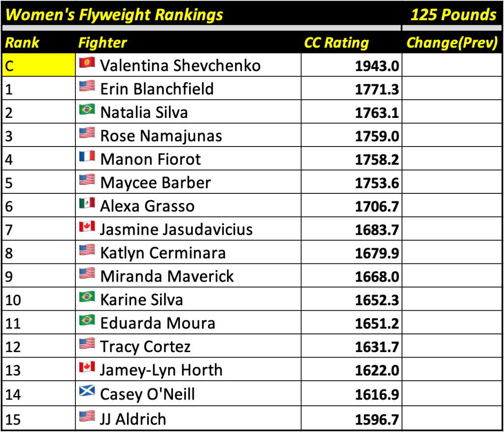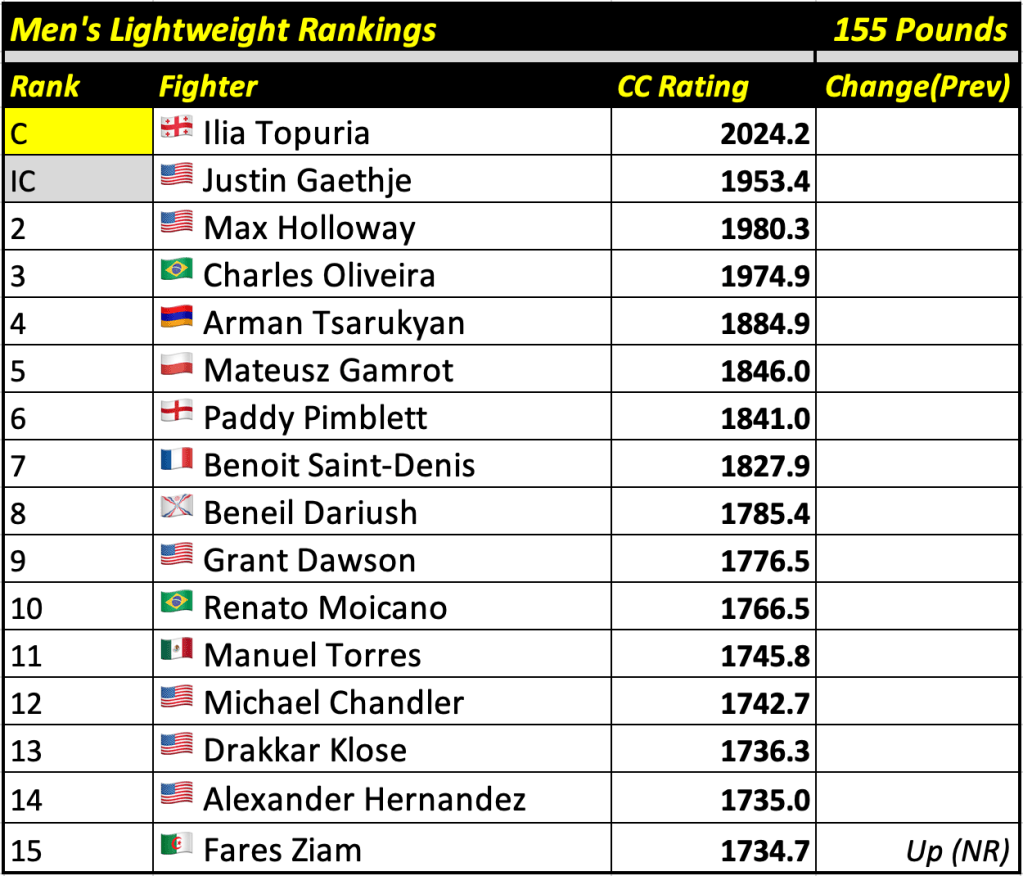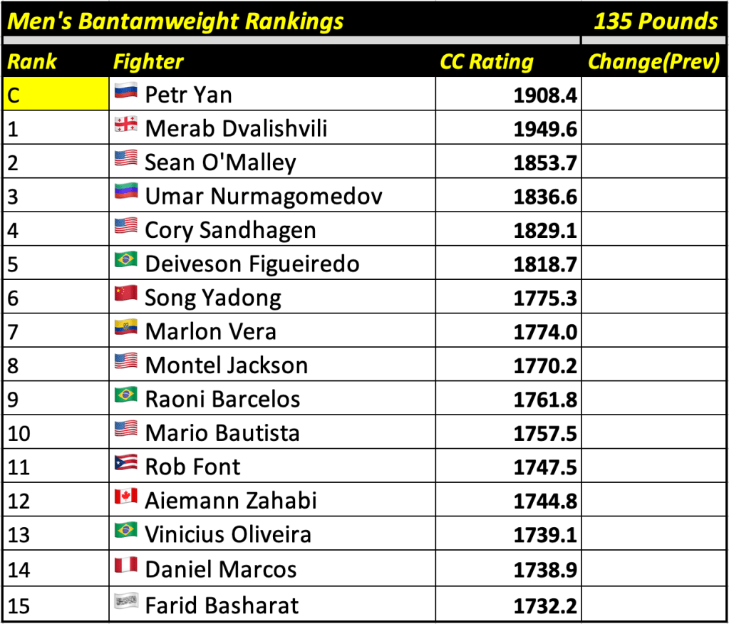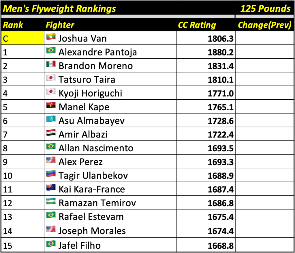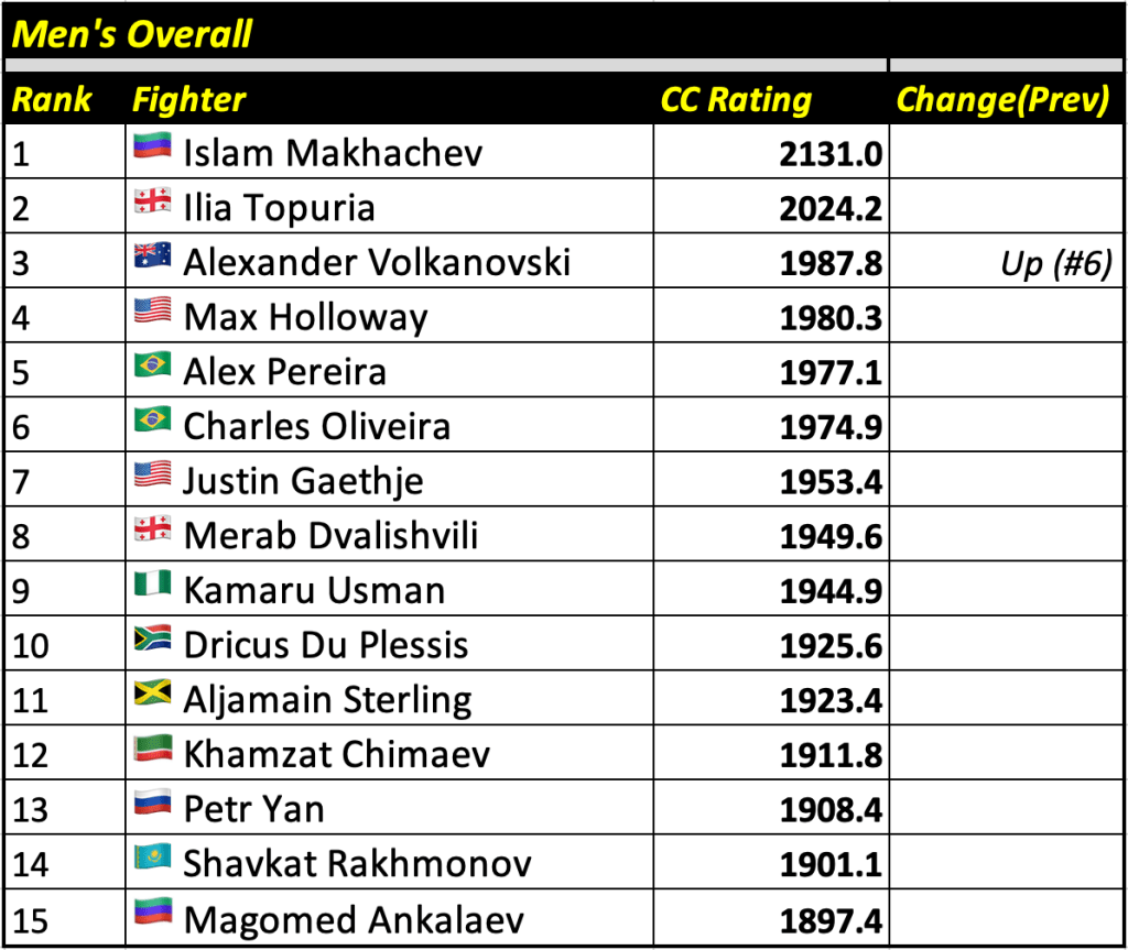 These rankings will also rank the top 15 male and female fighters overall. Note, we do not call them “pound-for-pound” rankings as most do, as the CC Rating is a metric of dominance and performance as opposed to talent relative to size. So, they will simply be called “Overall Male” and “Overall Female” rankings.