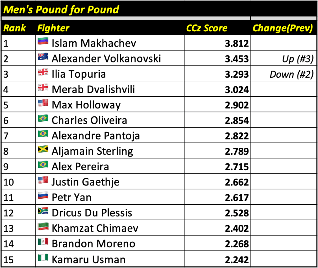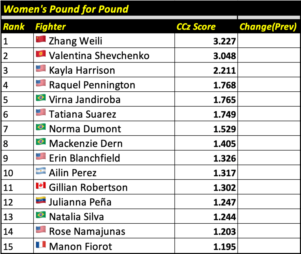 The Cage Calculus Pound for Pound Rankings is based on a fighter’s CCz Score. The CCz Score is a score that shows how much better a given fighter is than the average fighter in their respective weight class.