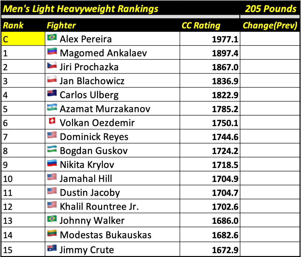 After every UFC fight card, Cage Calculus will publish up-to-date rankings based on our forecast algorithm. The rankings will display the champion and the top 15 contenders in each weight division, alongside their CC Rating (the champion will always be displayed at the top regardless of whether or not they are the highest rated fighter in their division).