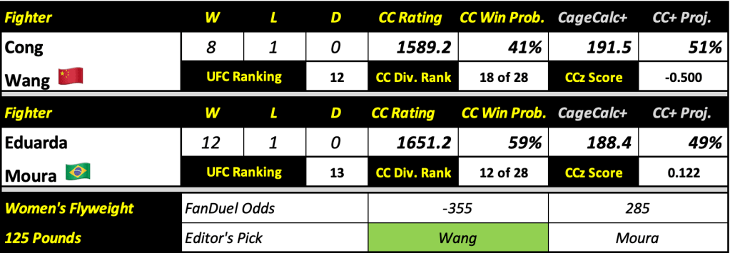 Editor’s Note: This fight should be closer. People want Cong Wang and Valentina Shevchenko to be the female version of the Alex Pereira and Israel Adesanya saga (Wang holds a victory over Shevchenko in pro kickboxing prior to both joining the UFC). Aside from that, the metrics on this fight are very close. Moura will need to get the fight to the ground. Wang’s takedown defense has been stellar, but she has surrendered a standing submission, her only pro loss. Wang should get it done in the end with good takedown defense and counter striking, but Moura is good value at +285.