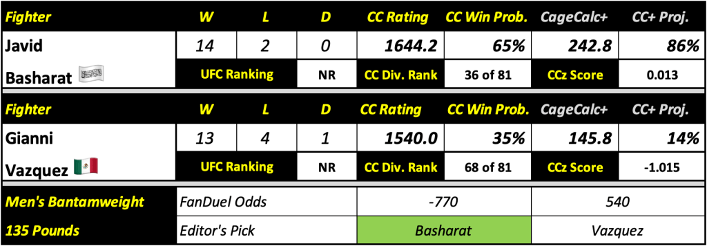 Editor’s Note: This is the most lopsided bout of the night. Vazquez is susceptible to submissions and he’s taking this fight on short notice as his UFC debut. The only question is whether Basharat will win by decision or submission.