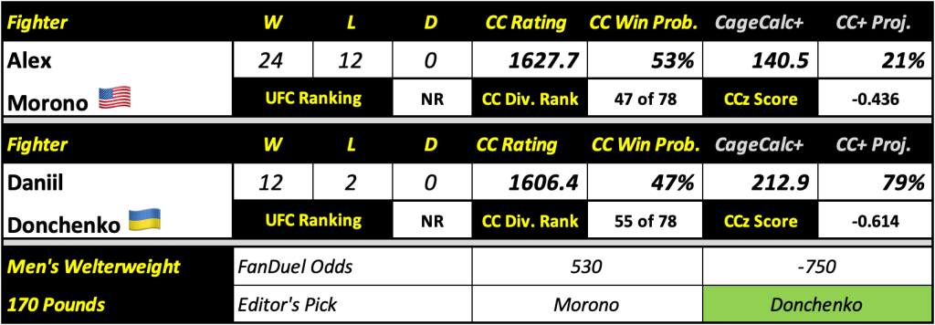 Editor’s Note: Two high volume strikers. This one should end relatively quickly. Donchenko has very good wrestling in his back pocket as well. He should use his speed and versatility to wear down Morono in any number of ways. Don’t overthink this one.
