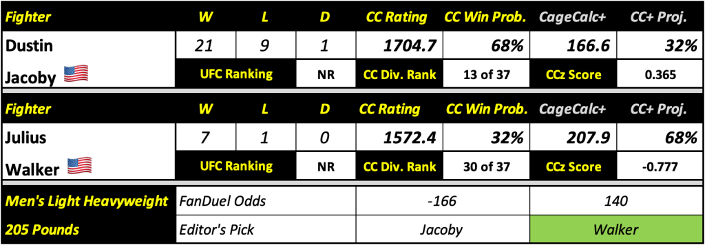 Editor’s Note: Jacoby is taking this fight on relatively short notice after Uran Satybaldiev pulled out. Setting that aside, this is still not a great matchup for Jacoby. Walker is longer, younger, and has the decided advantage in any wrestling or grappling exchanges. This comes down to Jacoby needing a KO (which he is capable of). Another thing to consider is that the CC ratings have Jacoby ranked higher than former champ Jamahal Hill. Either Jacoby is supremely underrated by the UFC or he’s been feeding off of lower level competition and needs a reversion to the mean. I’d bank on the latter.