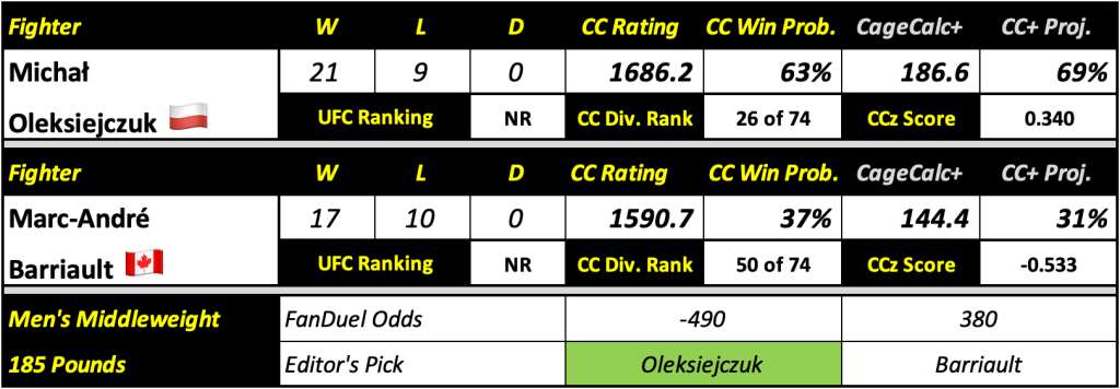 Editor’s Note: Oleksiejczuk is one of the most crisp strikers in this division. His only issue is that he gets submitted… a lot. However, Barriault is not a threat in that department, having only one submission across 17 career wins. Oleksiejczuk should be able to win with his striking, keeping this fight on the feet. The only question is whether he gets the finish.