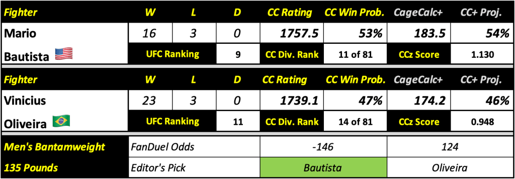 Editor’s Note: This is a big step up for Oliveira. As impressive as he’s looked thus far in his UFC career, Bautista is a different animal. He is very crisp on the feet. And, as he showed against Umar Nurmagomedov, he’s able to scramble on the ground with the best of them. Bautista should be able to clinically win the striking exchanges, forcing Oliveira to over-extend himself, at which point he’s smart enough to just widen his lead from there.
