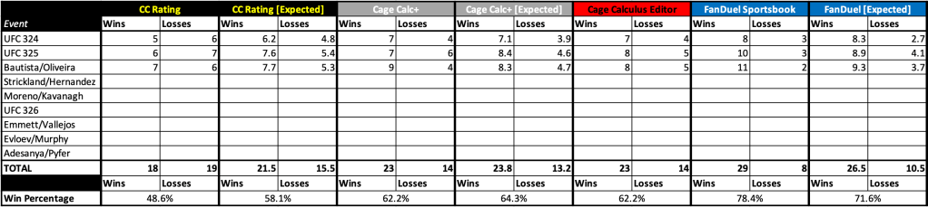 After every event, check back in to see how Cage Calculus did at forecasting the prior week’s slate of UFC fights. These standing will compare our traditional algorithm, our new CageCalc+ model, our editor’s picks, and FanDuel Sportsbook’s favorites. You can also see how many wins each algorithm expects, given the probabilities it generates (for example, if the algorithm gives ten fighters a 60 percent chance of winning, it would only expect six of them to win with those odds). How close the algorithm is to its expected numbers gives a better picture of its accuracy.
