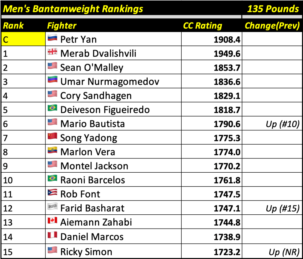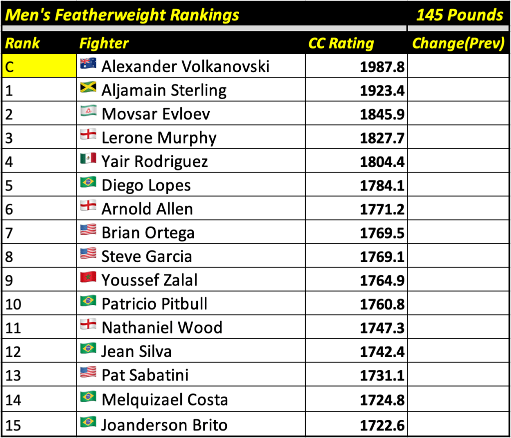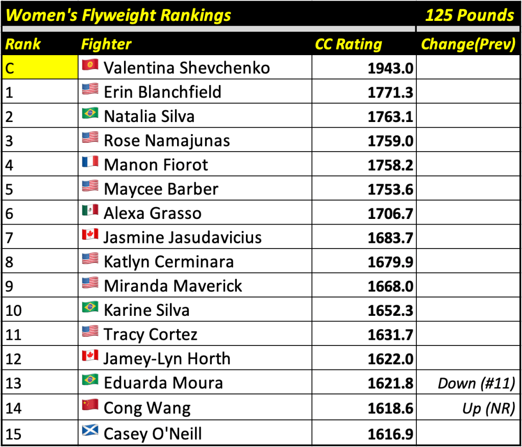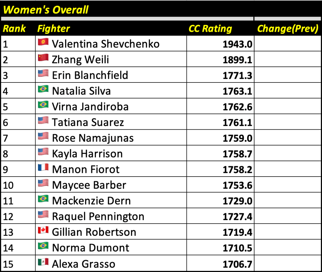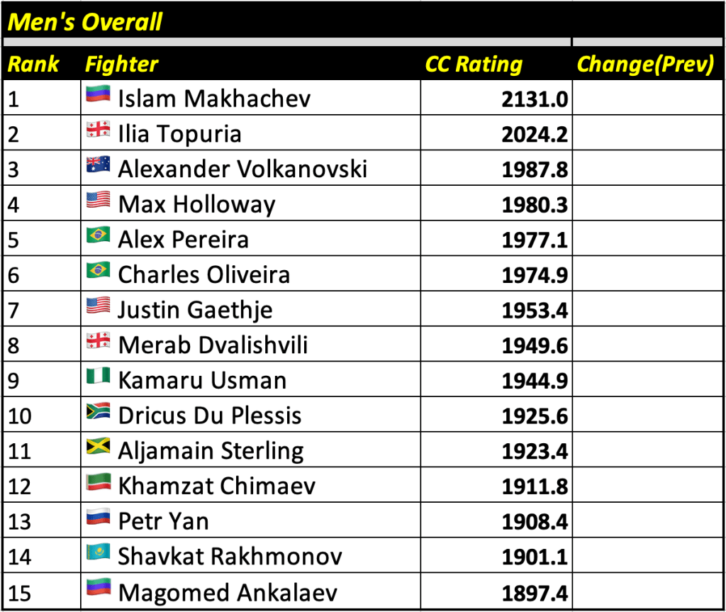 These rankings will also rank the top 15 male and female fighters overall. Note, we do not call them “pound-for-pound” rankings as most do, as the CC Rating is a metric of dominance and performance as opposed to talent relative to size. So, they will simply be called “Overall Male” and “Overall Female” rankings.