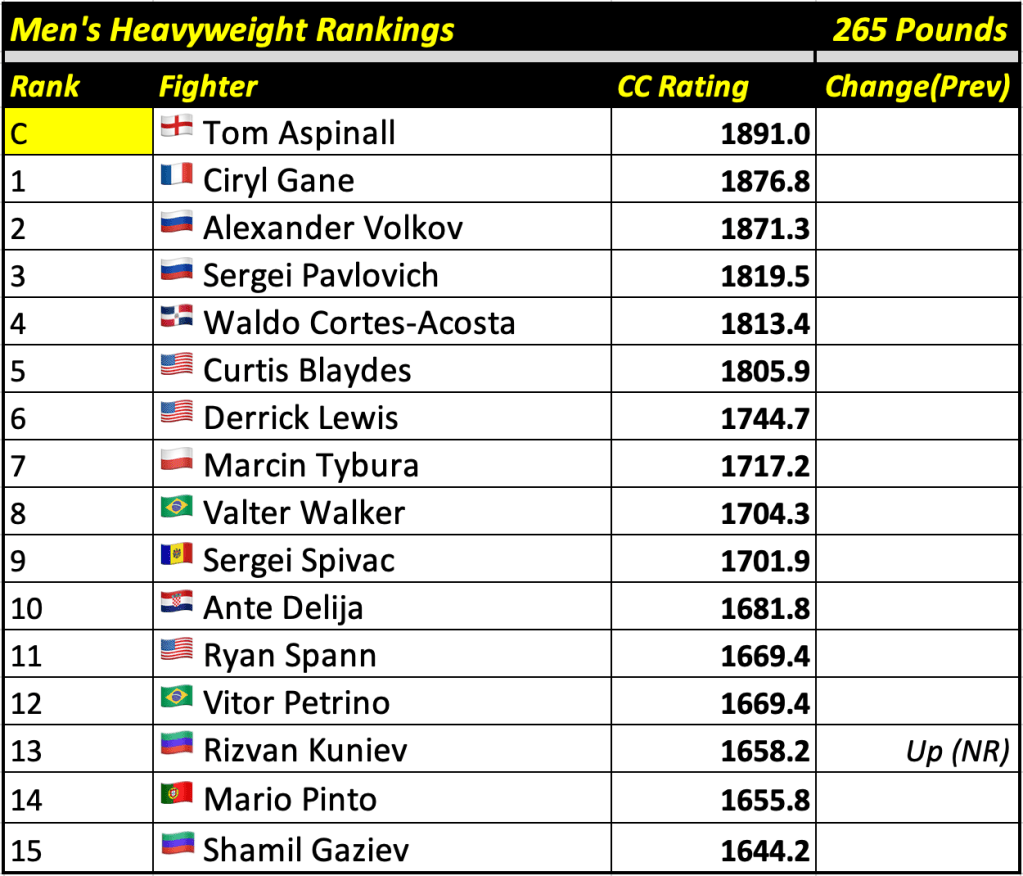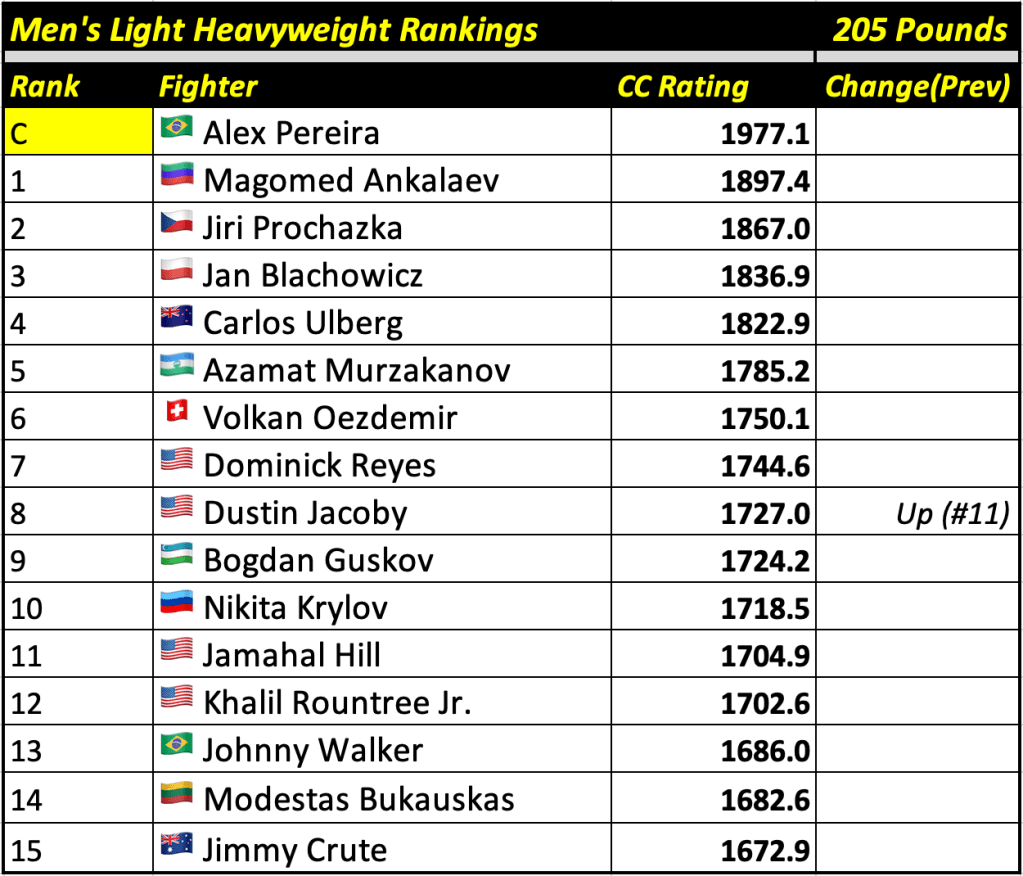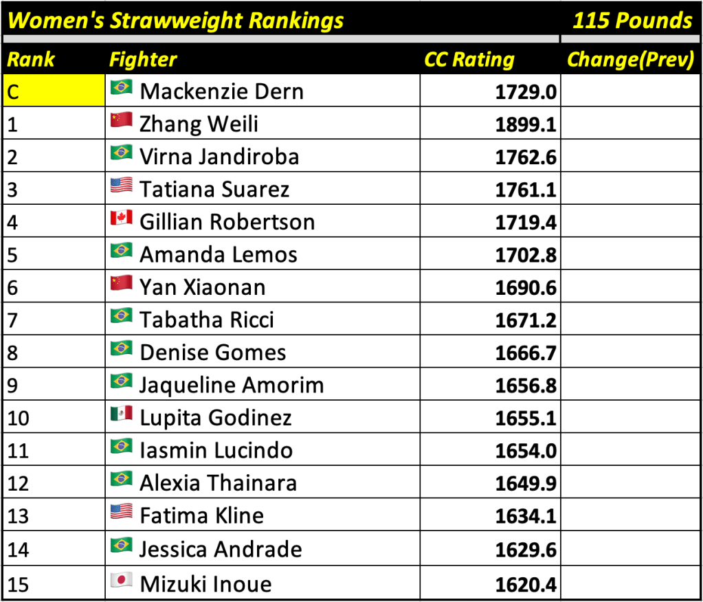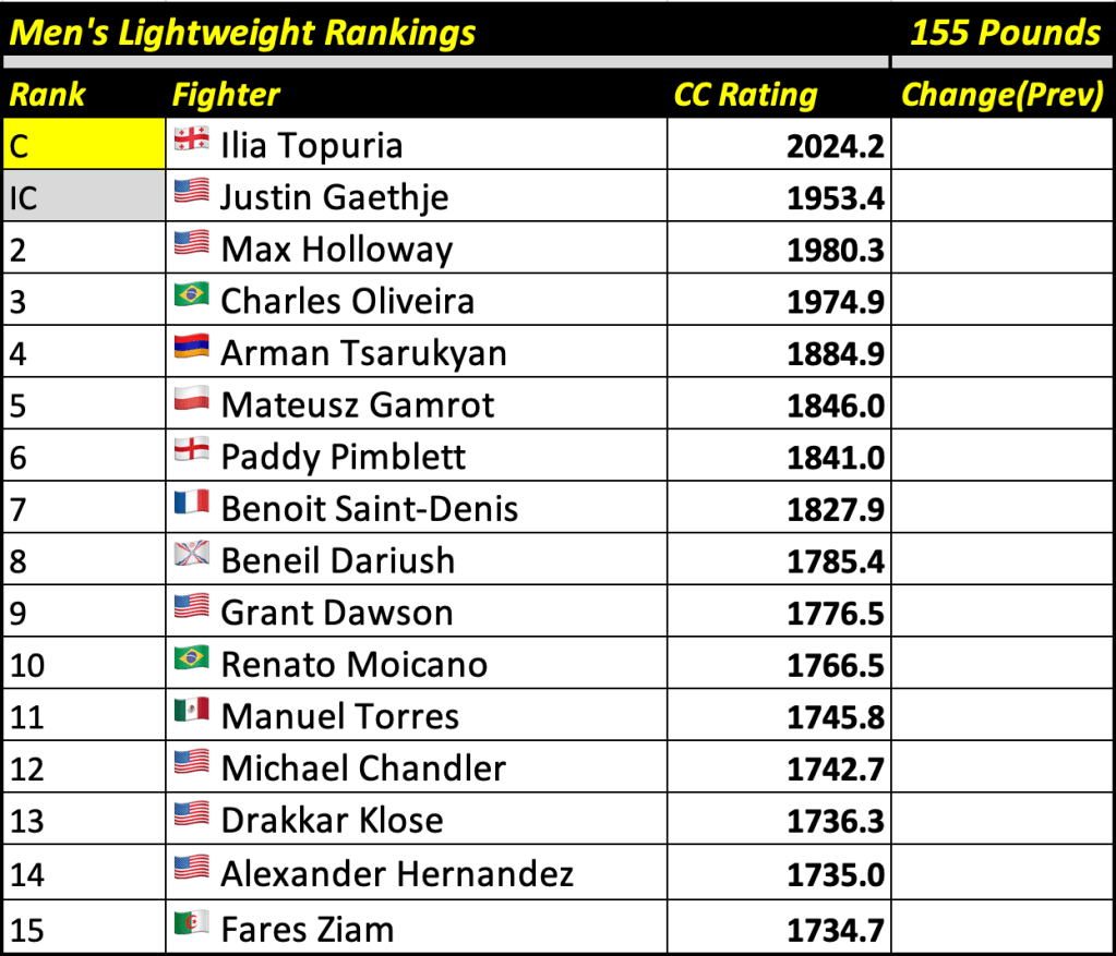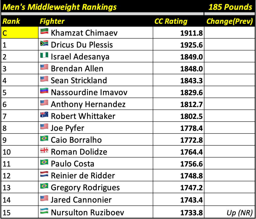 These rankings will also rank the top 15 male and female fighters overall. Note, we do not call them “pound-for-pound” rankings as most do, as the CC Rating is a metric of dominance and performance as opposed to talent relative to size. So, they will simply be called “Overall Male” and “Overall Female” rankings.