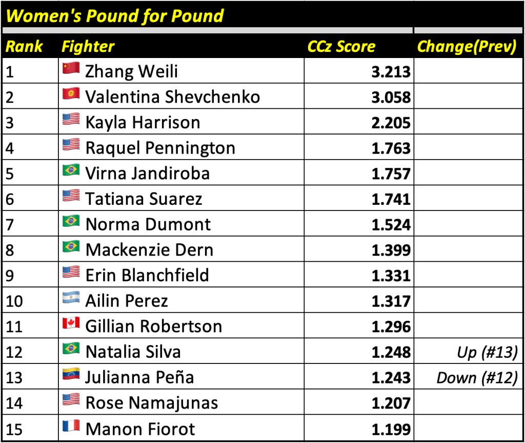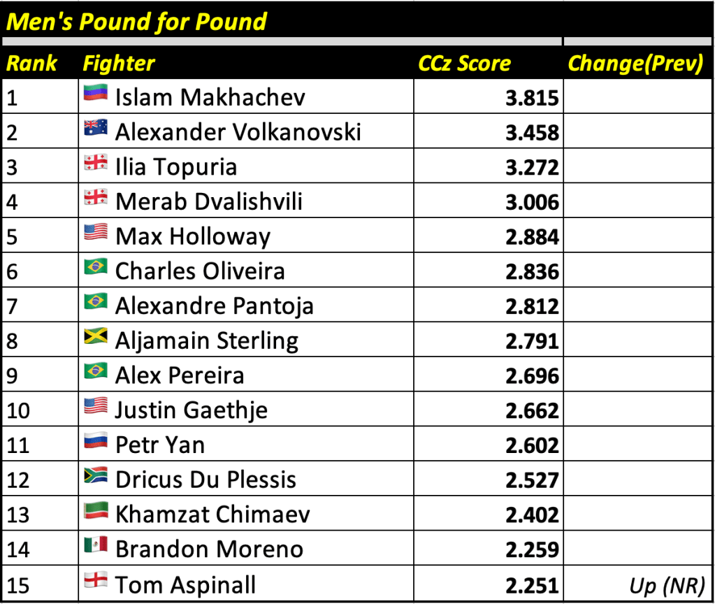 The Cage Calculus Pound for Pound Rankings is based on a fighter’s CCz Score. The CCz Score is a score that shows how much better a given fighter is than the average fighter in their respective weight class.